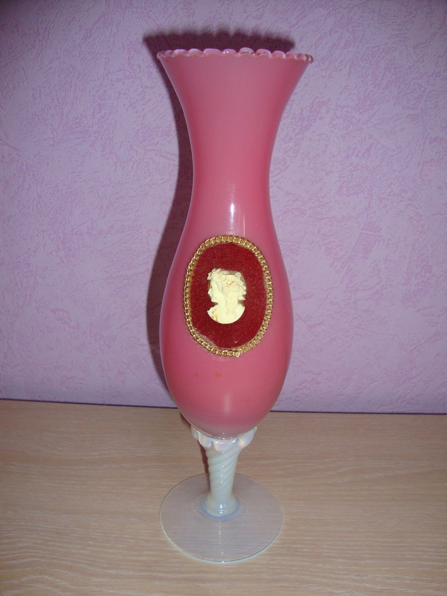 Vase en opaline rose pied blanc torsadé