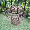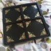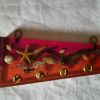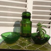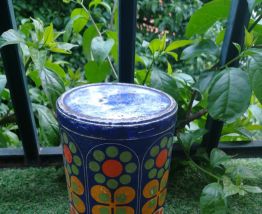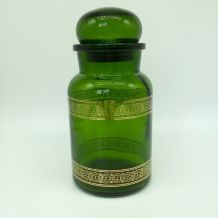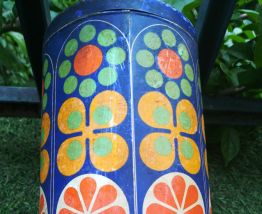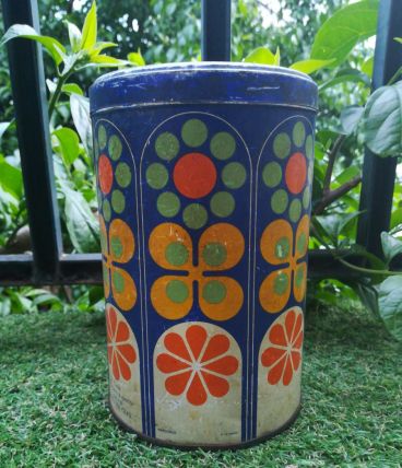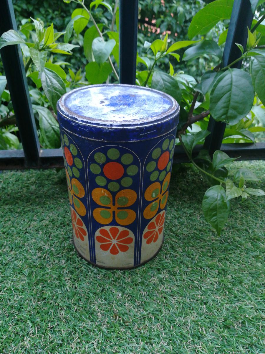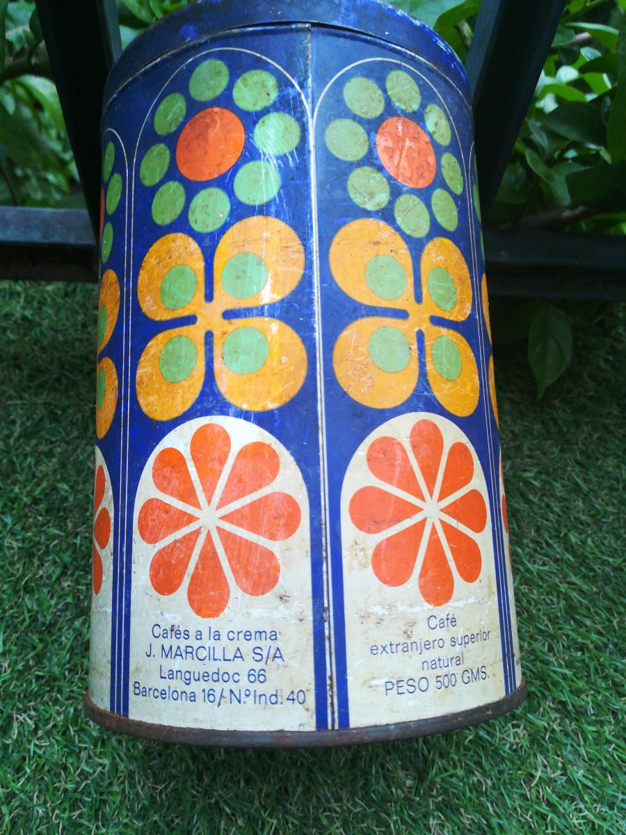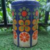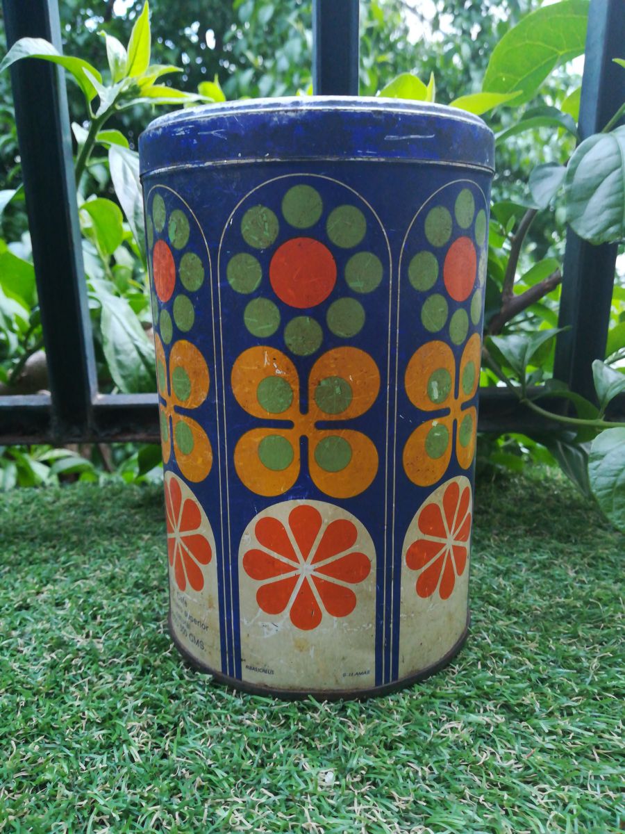 Boite ronde en métal a motifs des années 60 d'origine catalane, Barcelone. De couleurs bleue, verte, orange et beige, avec couvercle.
