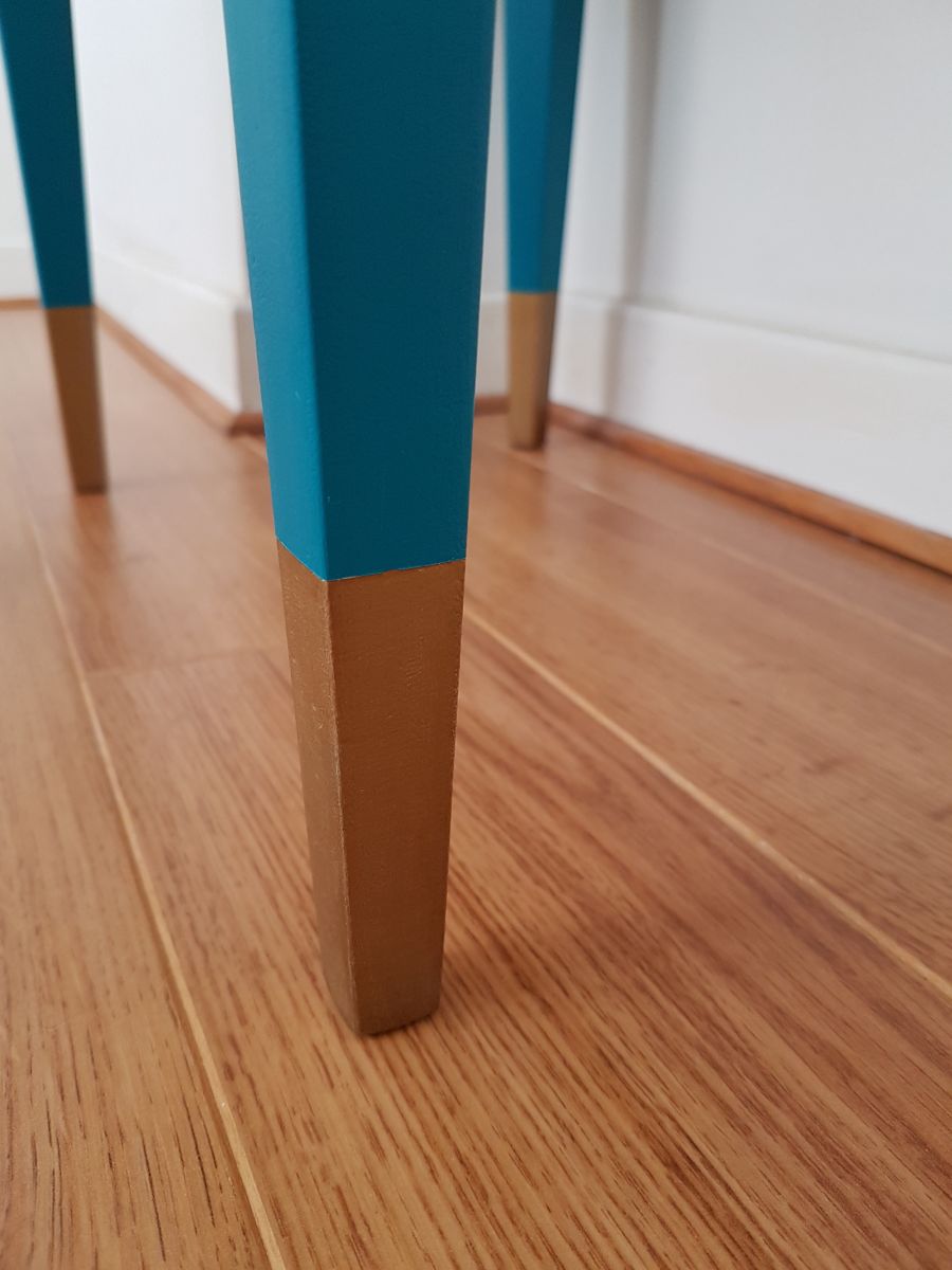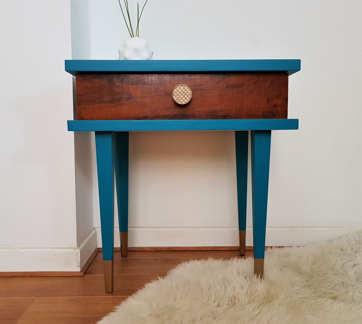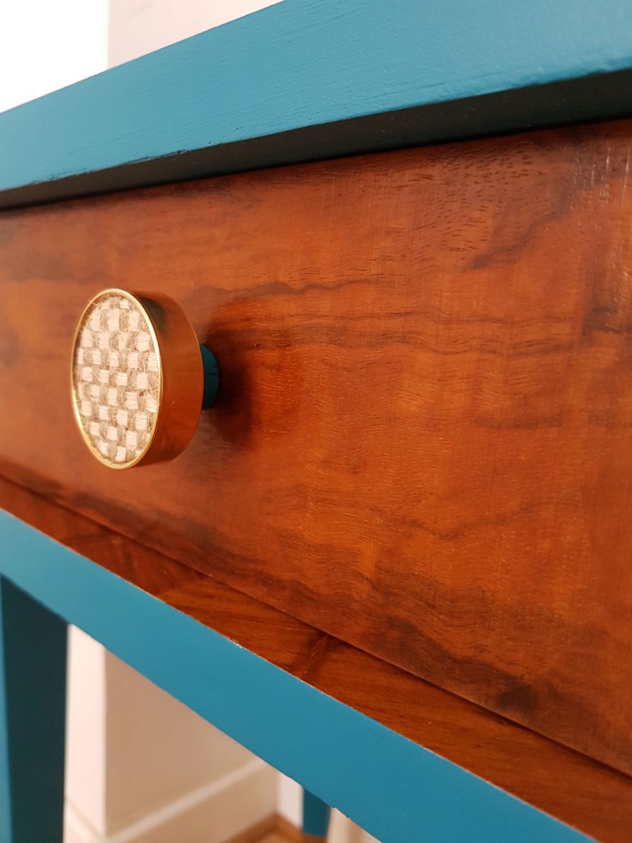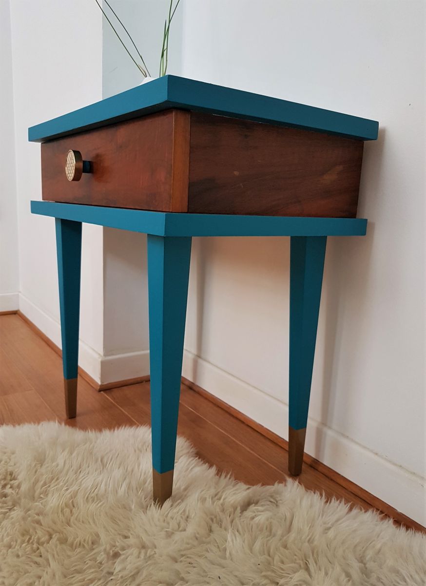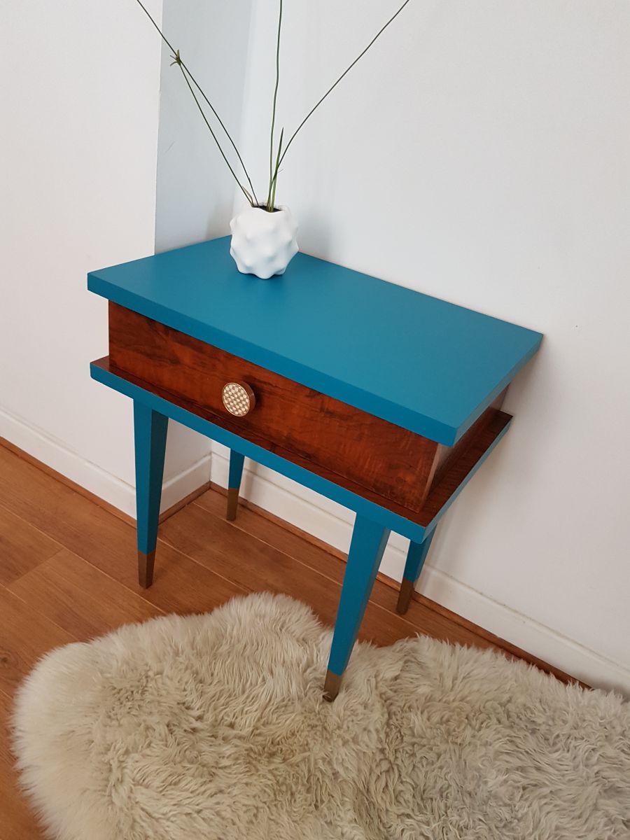 Table de chevet un tiroir plaqué noyer, revêtue de peinture bleue et dorée, vernie.