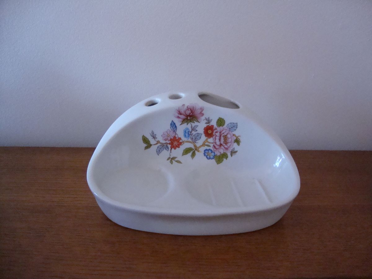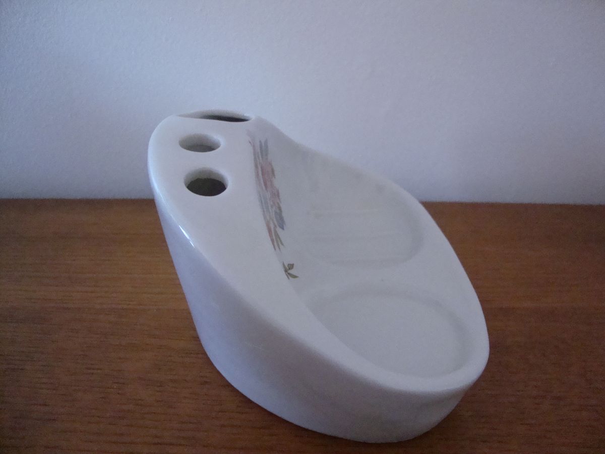 Joli Nécessaire de toilette ancien ( porte-savon, gobelet, dentifrice et brosse à dents) en céramique blanche décorée de fleurs