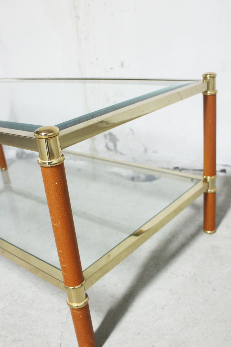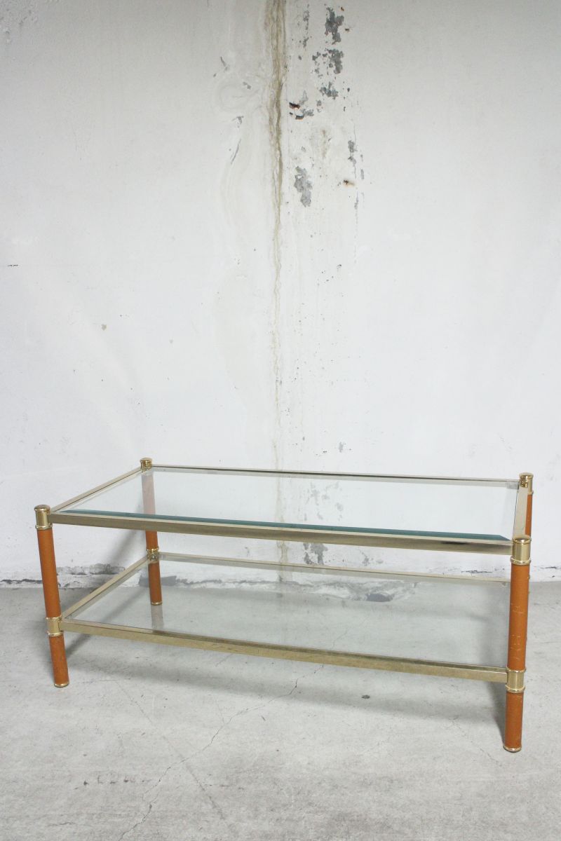 Superbe table basse LANCEL en verre et pieds en métal doré et cuir.