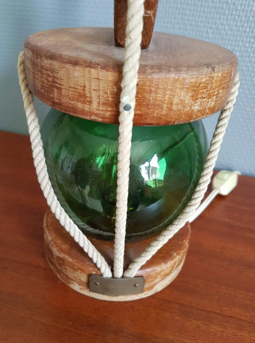 lampe vintage lanterne de pêcheur, globe en verre vert, bois et corde.