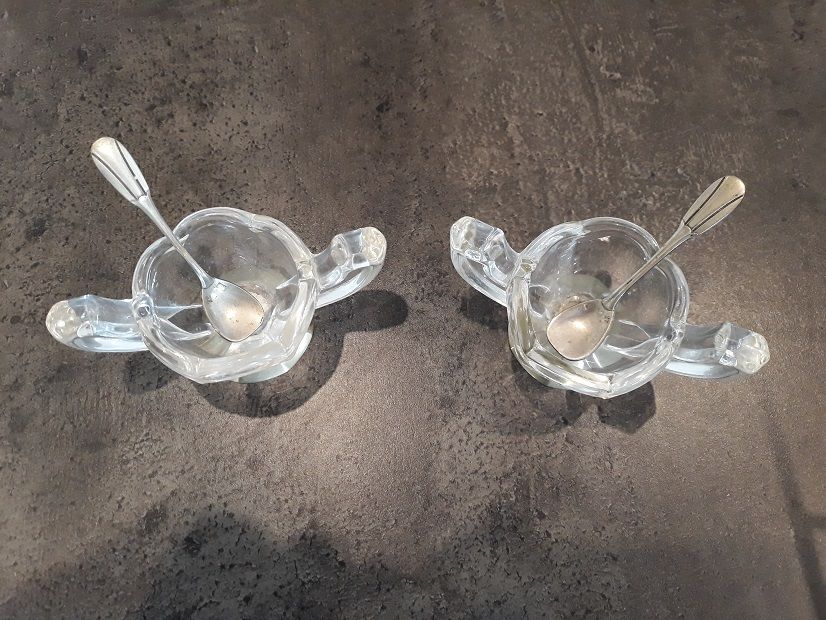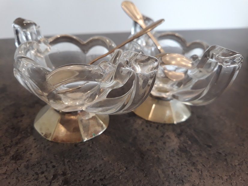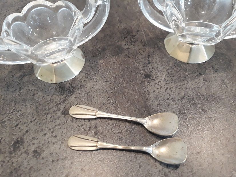 2 salerons en verre et métal argenté avec cuillères en métal argenté également (poinçons)