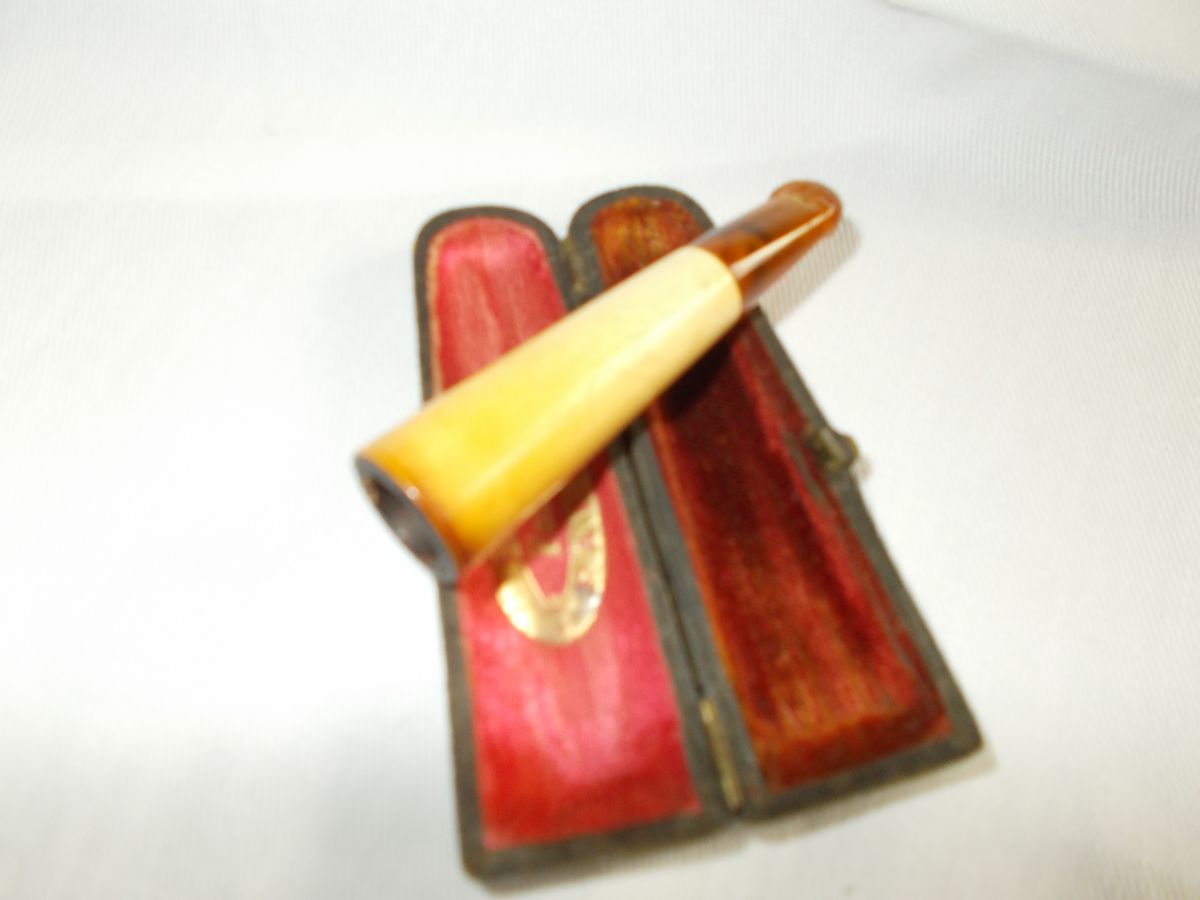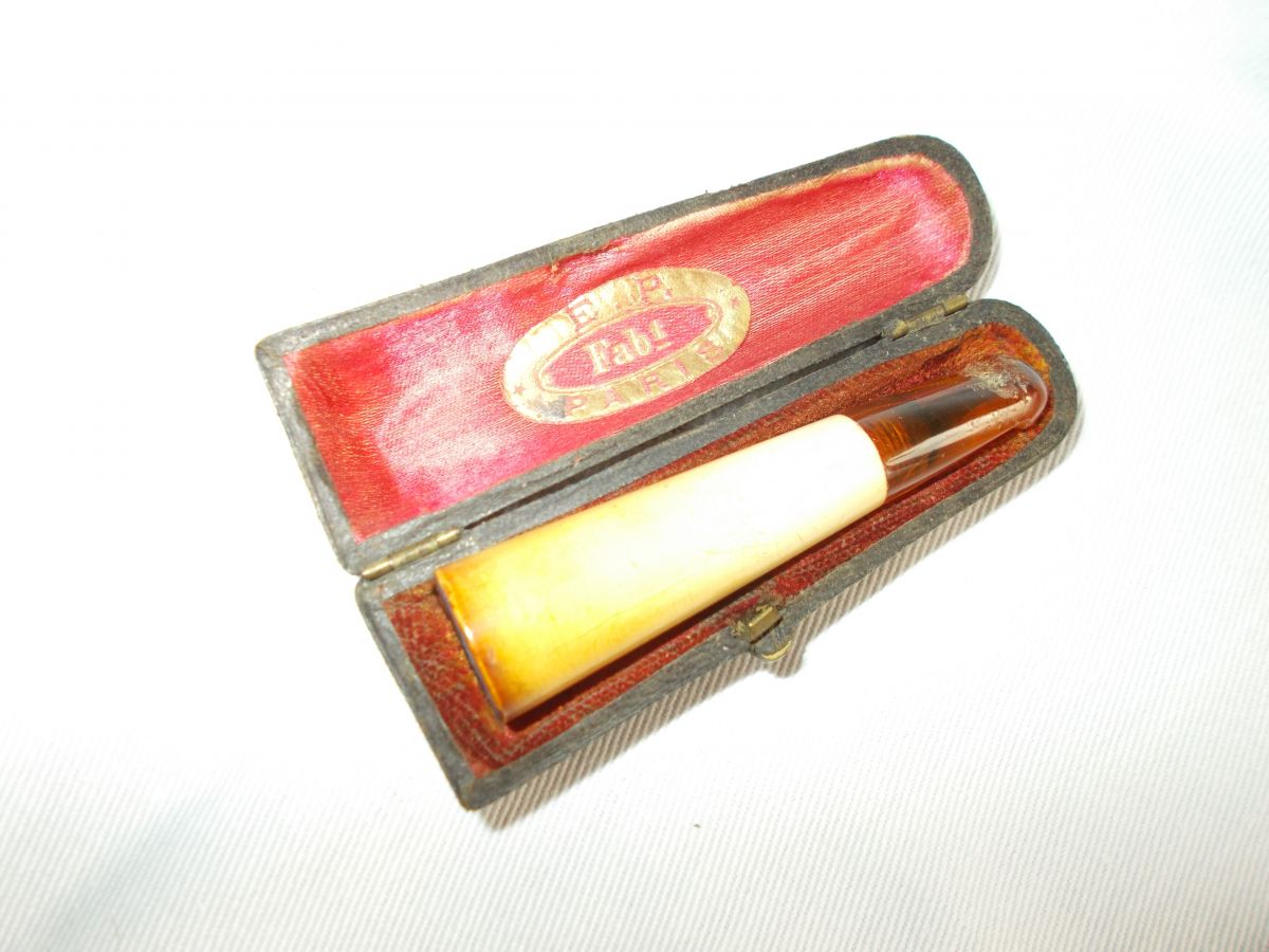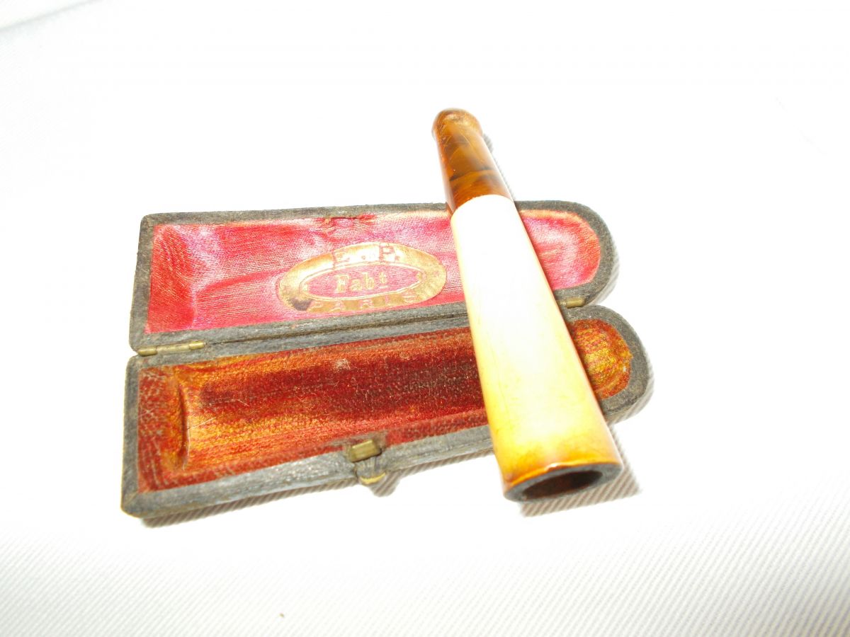 Ancien fume cigarette en ecume de mer et ambre- etui d origine. 5 cm--.Bon état