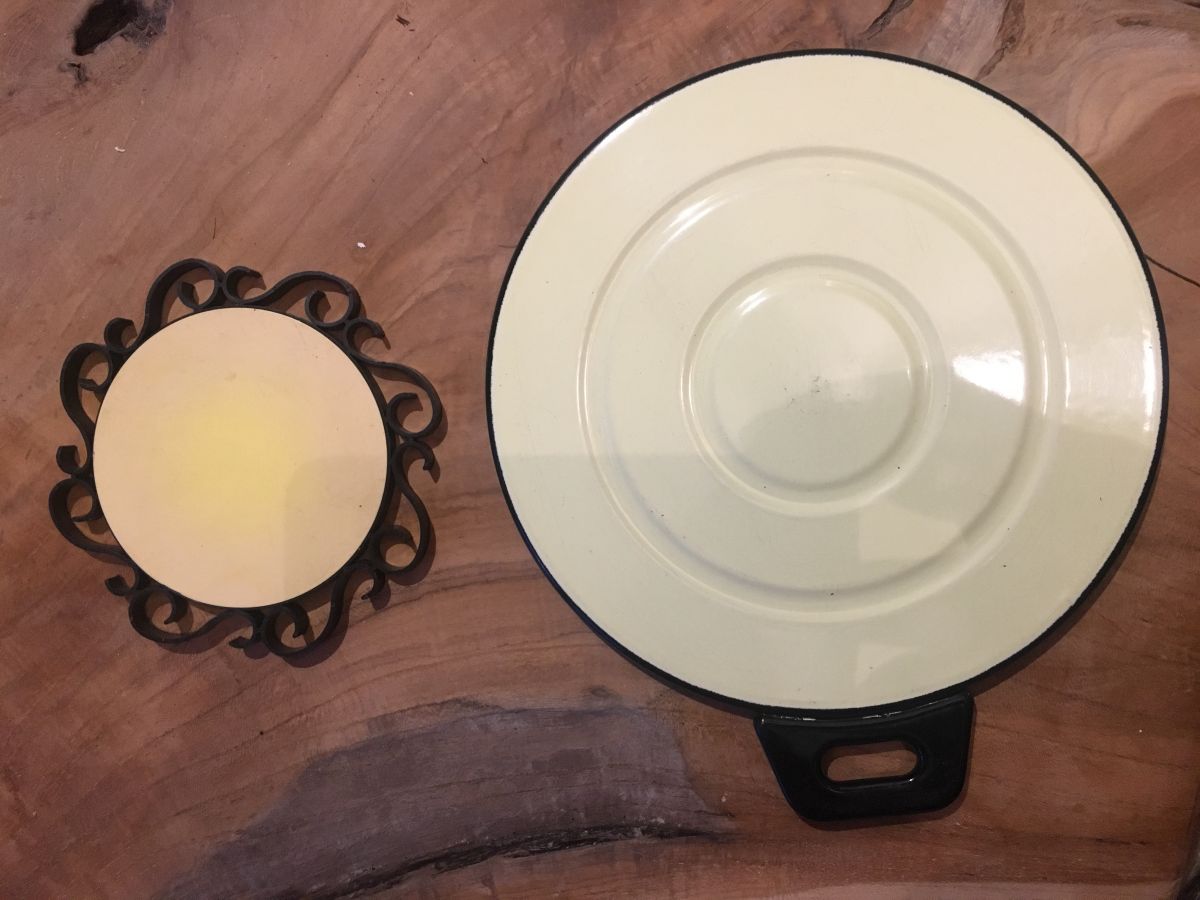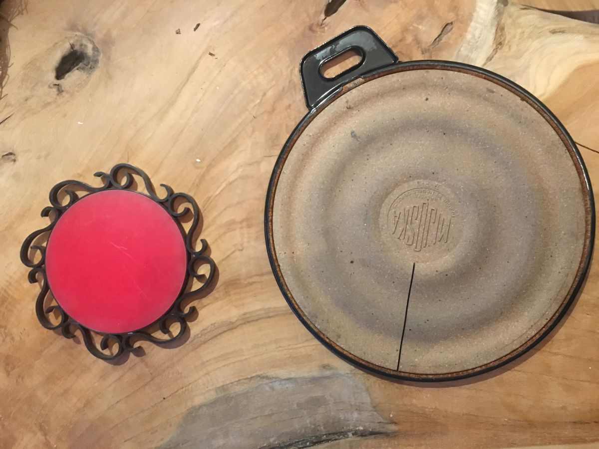 Sous-plats vintage de diamètres respectifs 13 cm (en plastique) et 20 cm (métal et pierre).