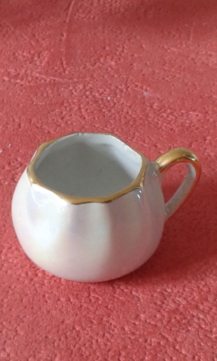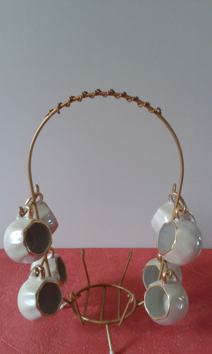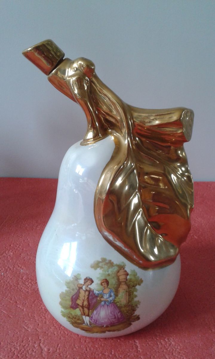 Service à liqueur vintage (années 60/70) complet en parfait état composé d'une jolie bouteille en forme de poire avec sa grande feuille dorée et huit tasses bordé d'un liseré doré. Bouchon doré. Le tout est posé sur un support en métal doré.