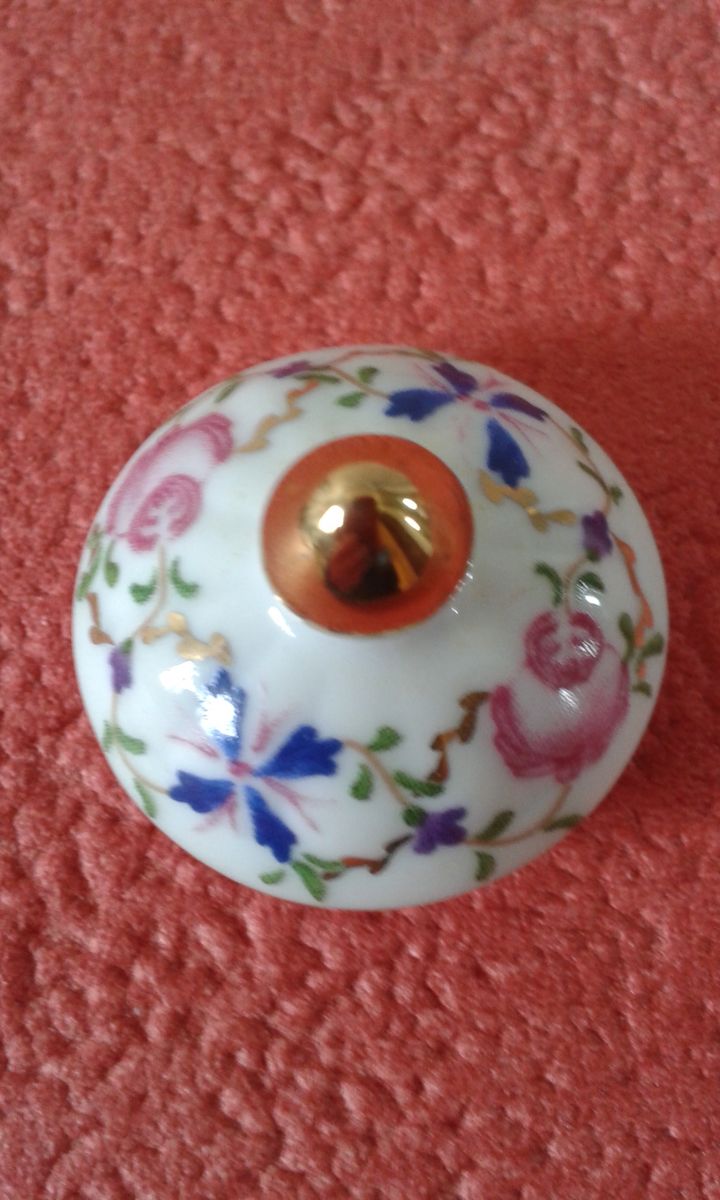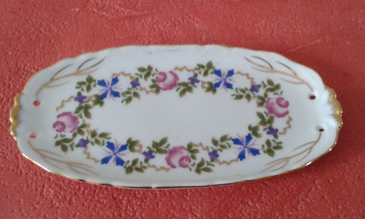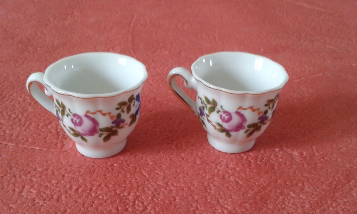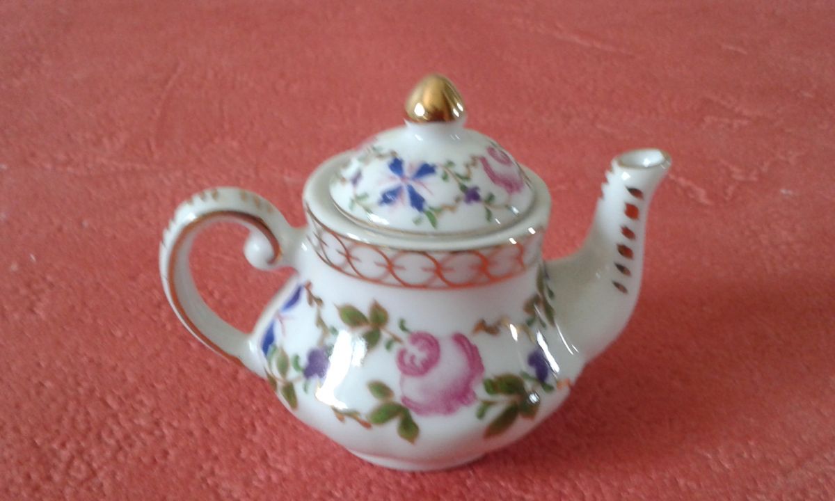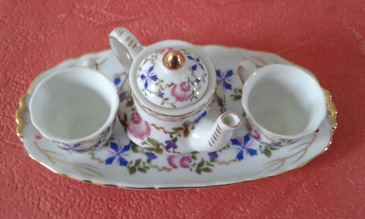 Théière et ses deux tasses miniature posées sur un plateau. La théière, les tasses et le plateau sont bordés d'un liseré doré.
