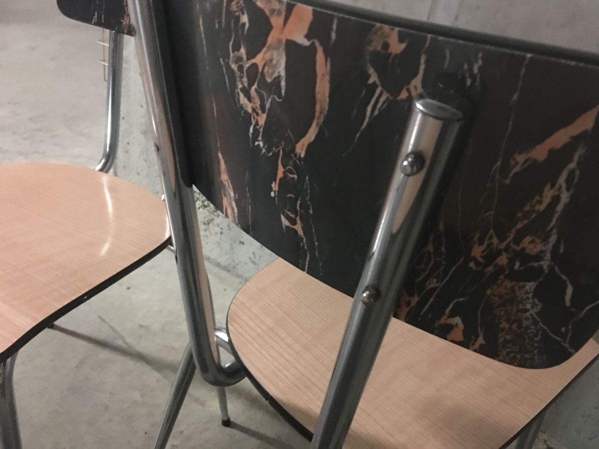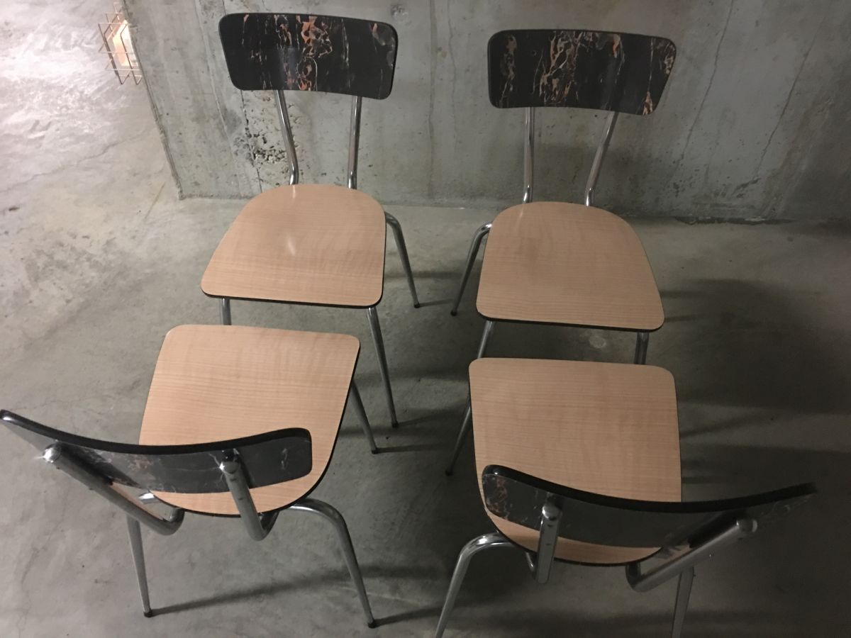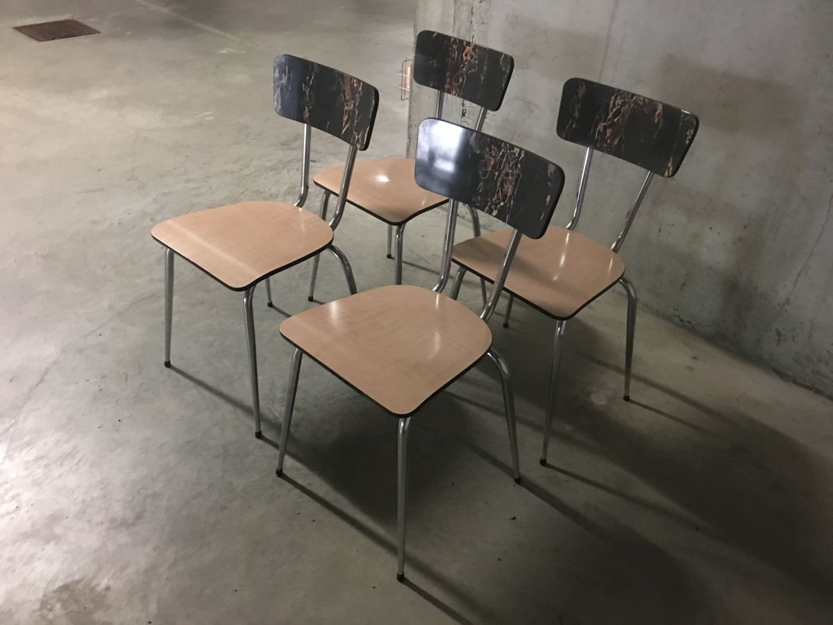 Ensemble de 4 chaises en formica bicolore beige et imitation marbre des Pyrénées noir, une chaise dont le dossier a été reboulonné (réparation visible – voir photos), les 3 autres étant en bon état, hauteur totale 77cm, hauteur assise 43cm, assise 35x37cm.