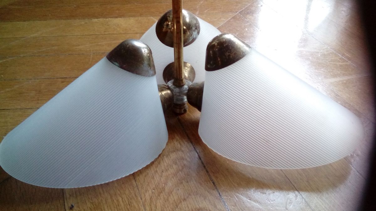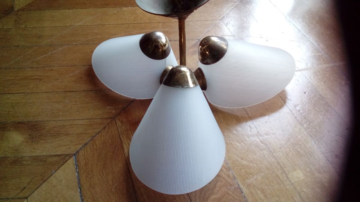 Luminaire vintage des années 50 à 3 tulipes avec cornet en plexiglass rainuré. La structure est en laiton et l'electrification est d'origine. En bon état.
