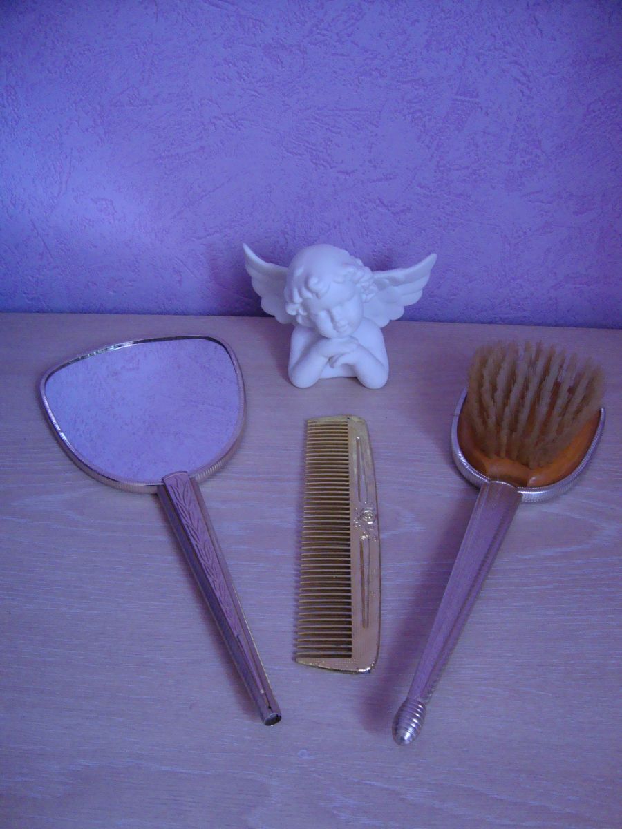 composé d'un miroir, d'une brosse entourés de métal doré ainsi que le manche et d'un peigne.