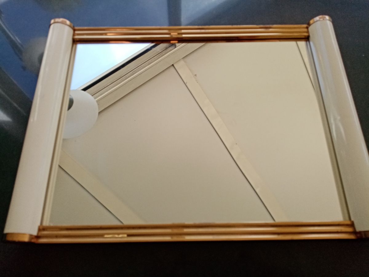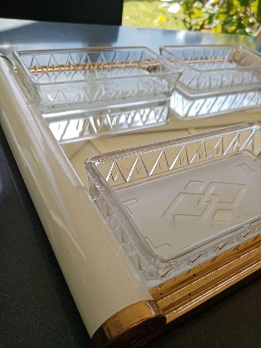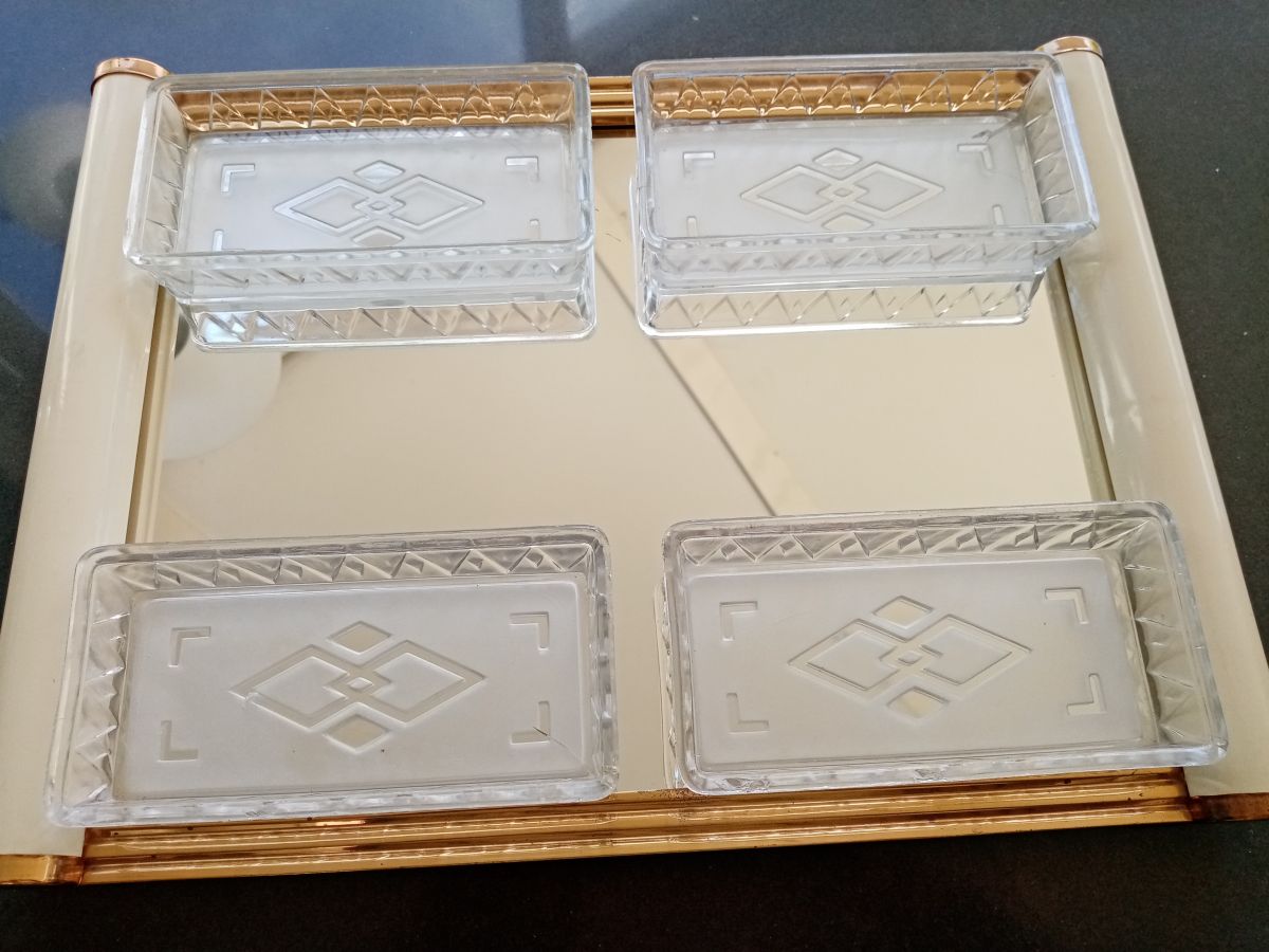 Plateau art déco avec ses ramequins en bon état. Petit défaut de tain dû à l'âge mais pas de rayure.
