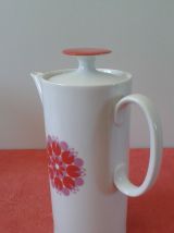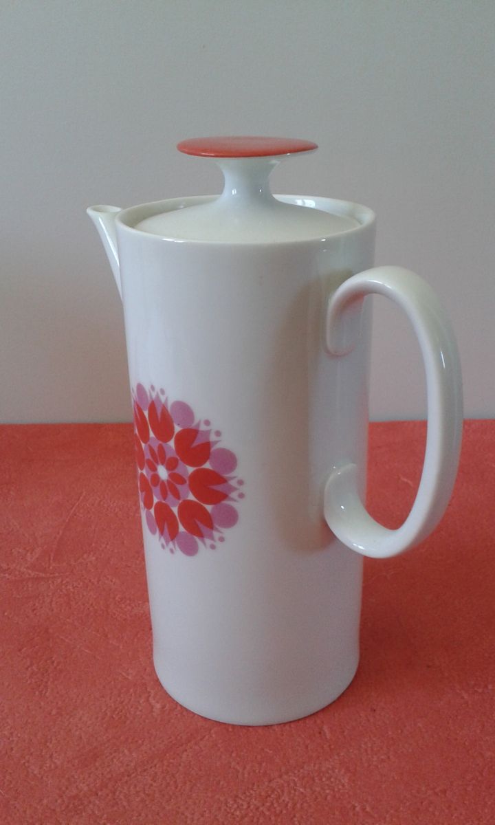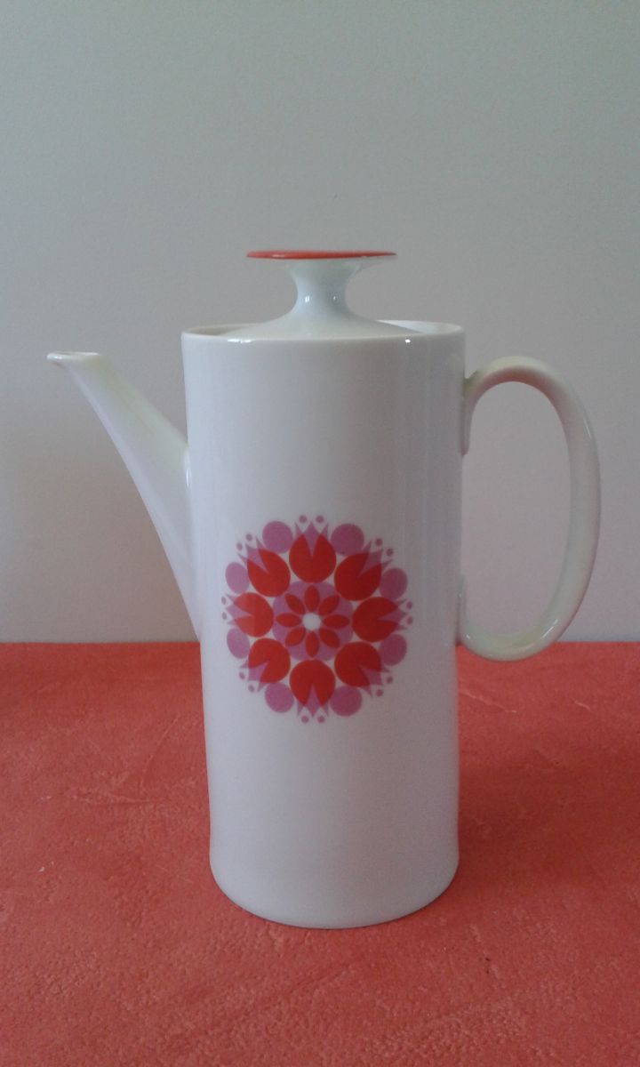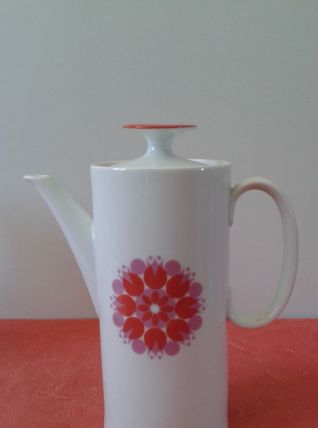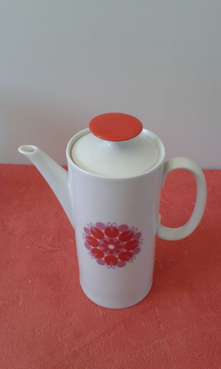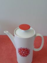 Très jolie cafetière (ou théière ) allemande vintage en porcelaine. Design pop blanc Moulin à Vent orange issu de la Collection Médaillon dessinée en 1962 par le designer suisse Hans Théo Baumann.