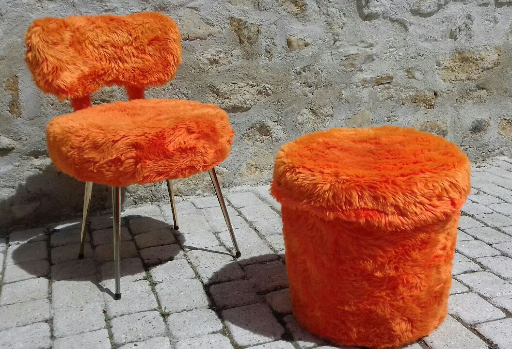 Magnifique chaise moumoute vintage avec son pouf faisant coffre et sa superbe couleur orange, très tendance avec un mobilier vintage ou scandinave.