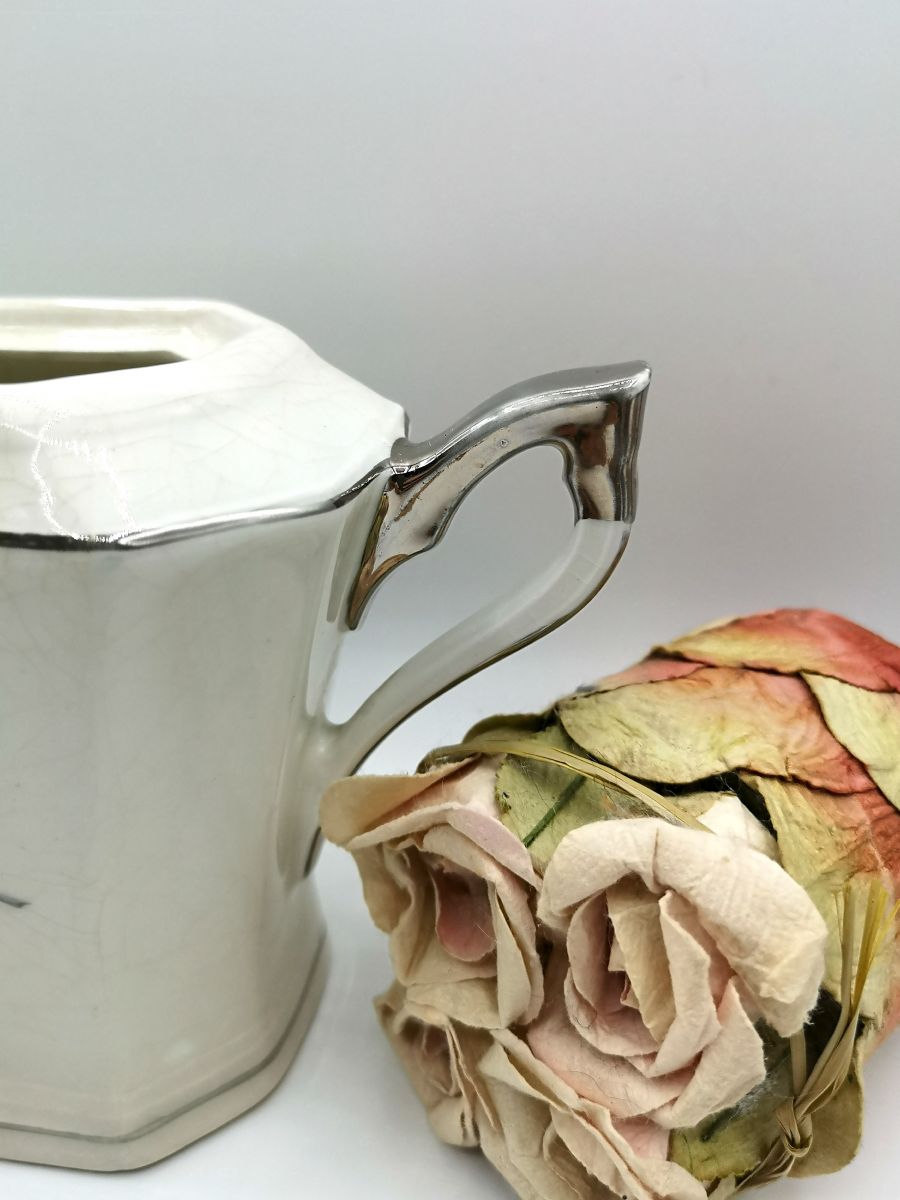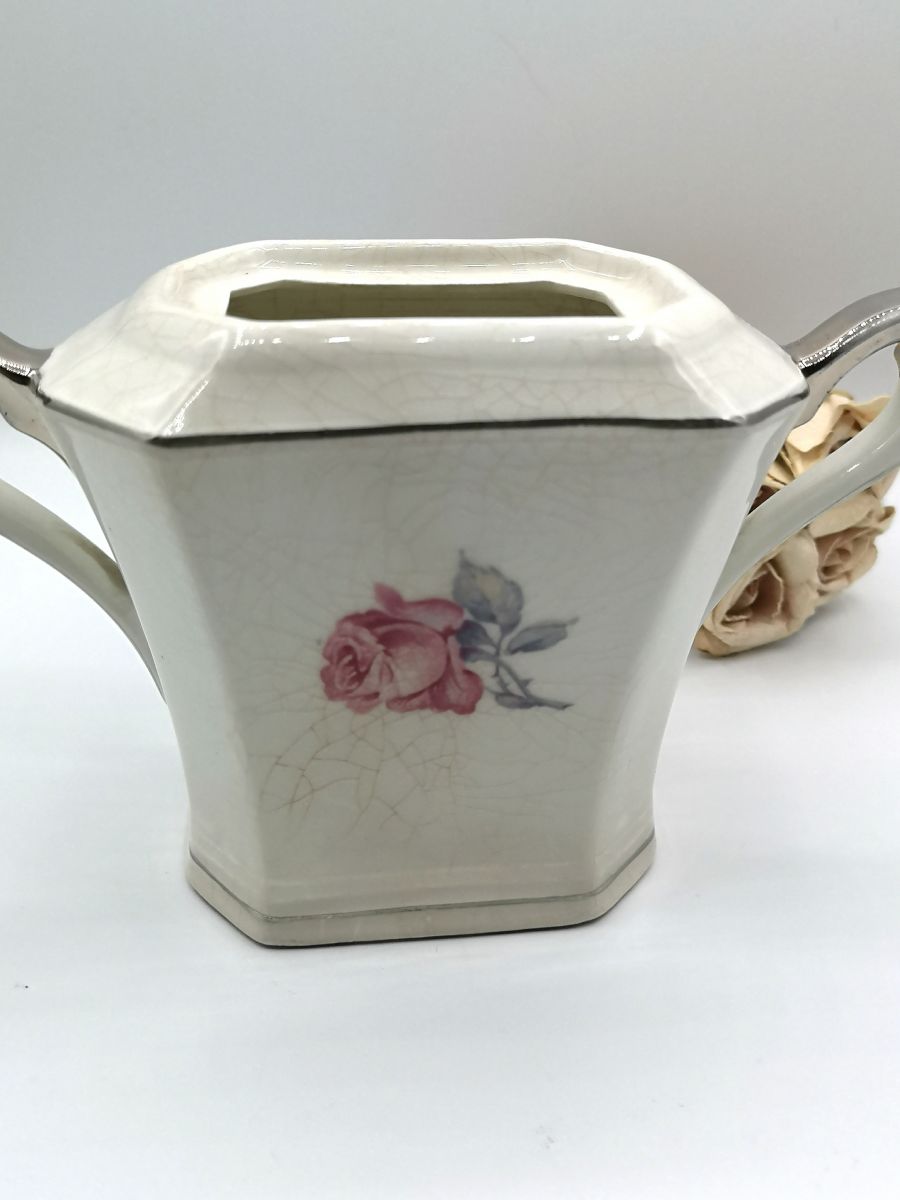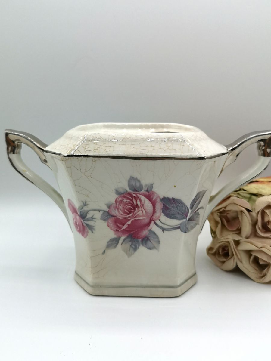 Sucrier en céramique, à anses , la peinture de la céramique à un effet craquelé qui renforce encore le côté vintage de ce très jolie pot. Roses peintes sur les deux faces (grosses pour le recto et une petite pour le verso). Liserer d'argent ainsi que la moitié des anses.