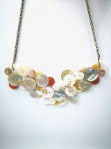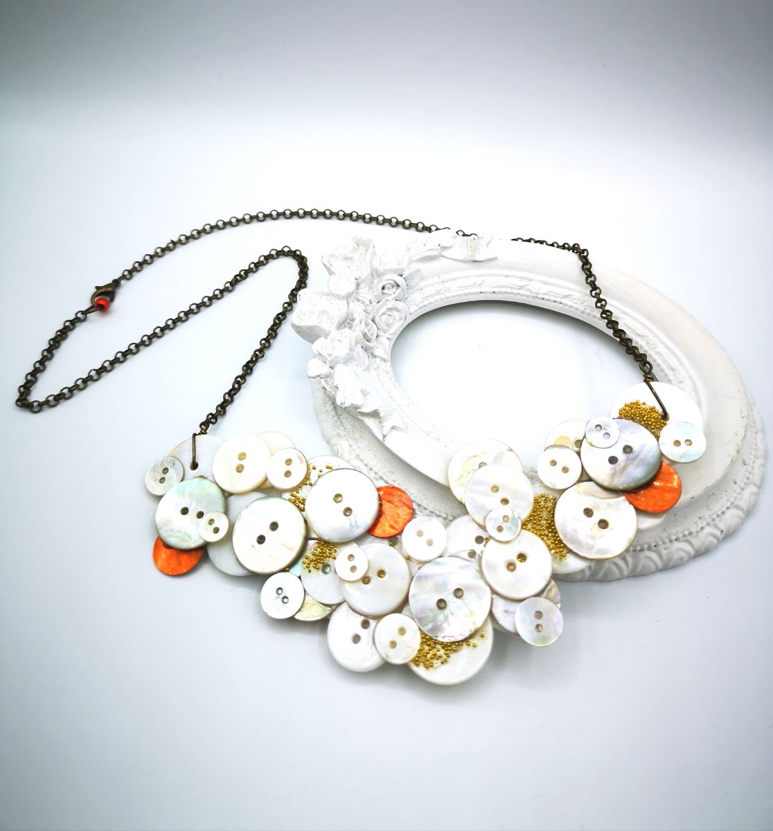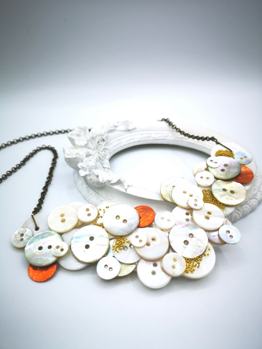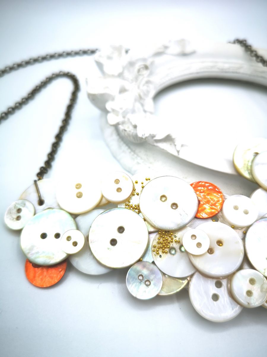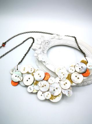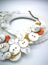 Collier unique pour une femme unique, cette très belle pièce a été imaginée et réalisée avec beaucoup de soins. Les boutons en nacre ainsi que les sequins ont été assemblés afin de réaliser un plastron aux proportions élégantes, pour mettre en valeur le bijoux et la femme qui le porte.