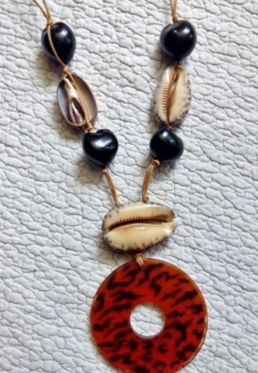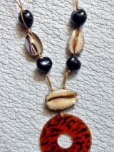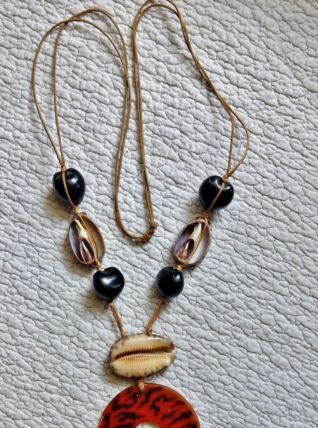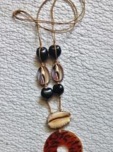 Monté sur cordon beige & boules en bois et coquillages des Philippines.