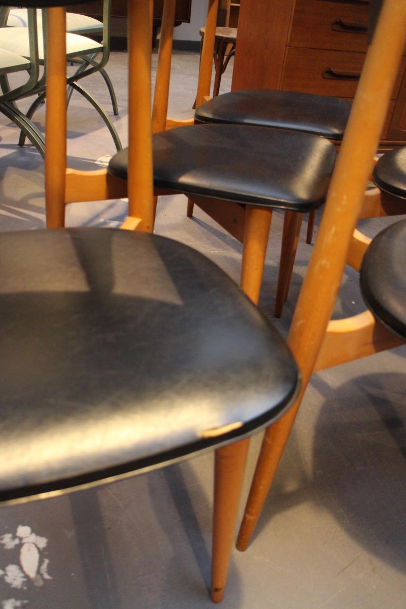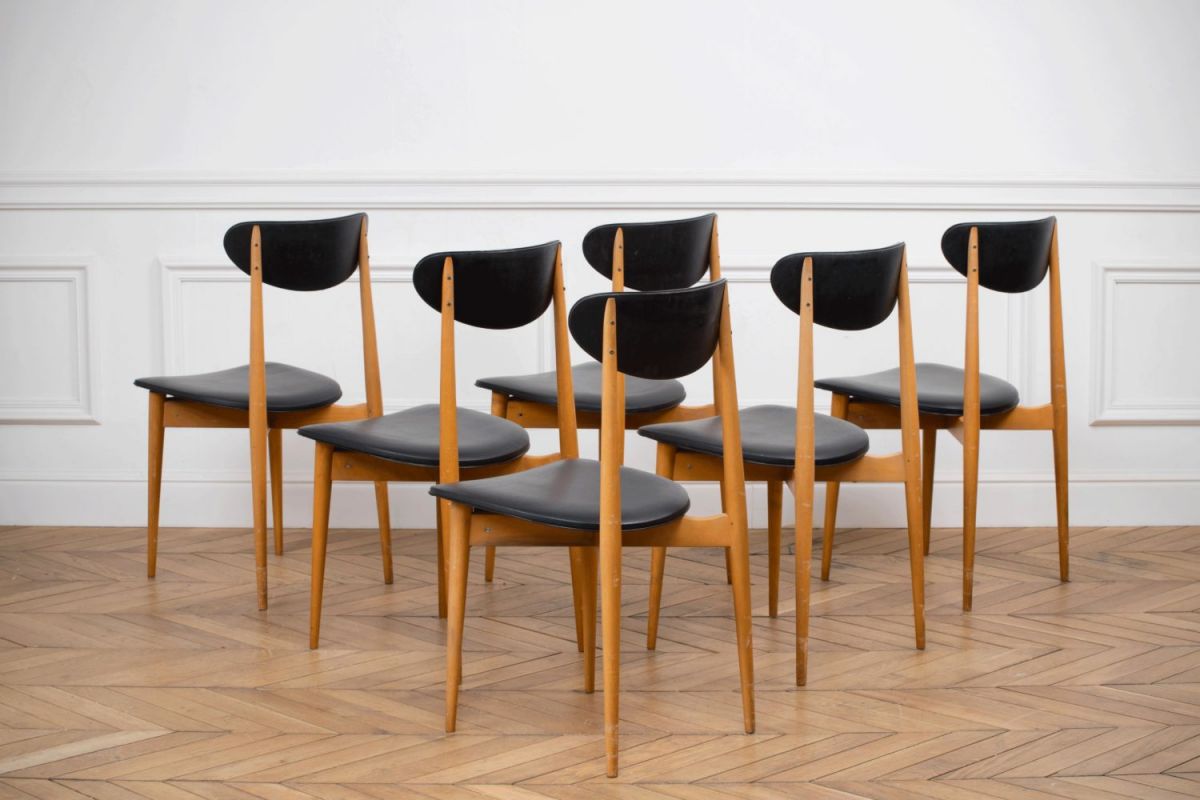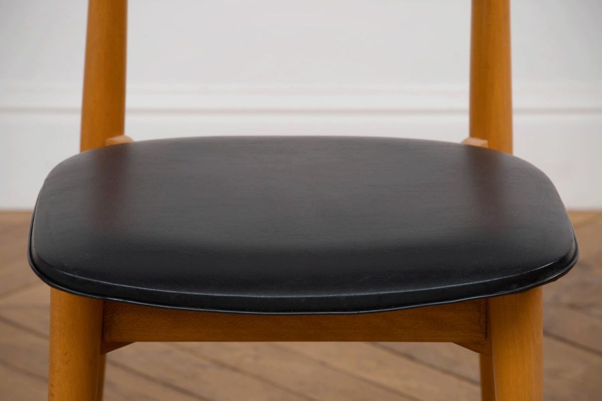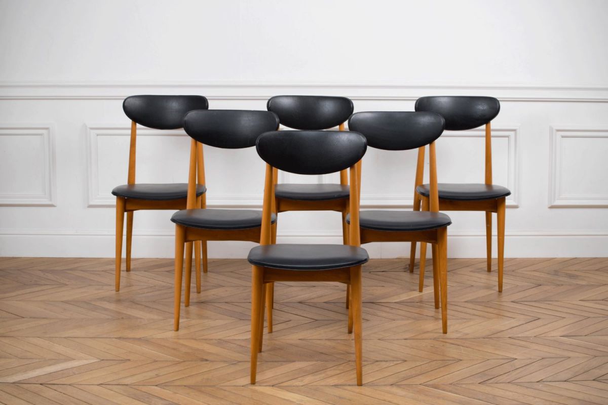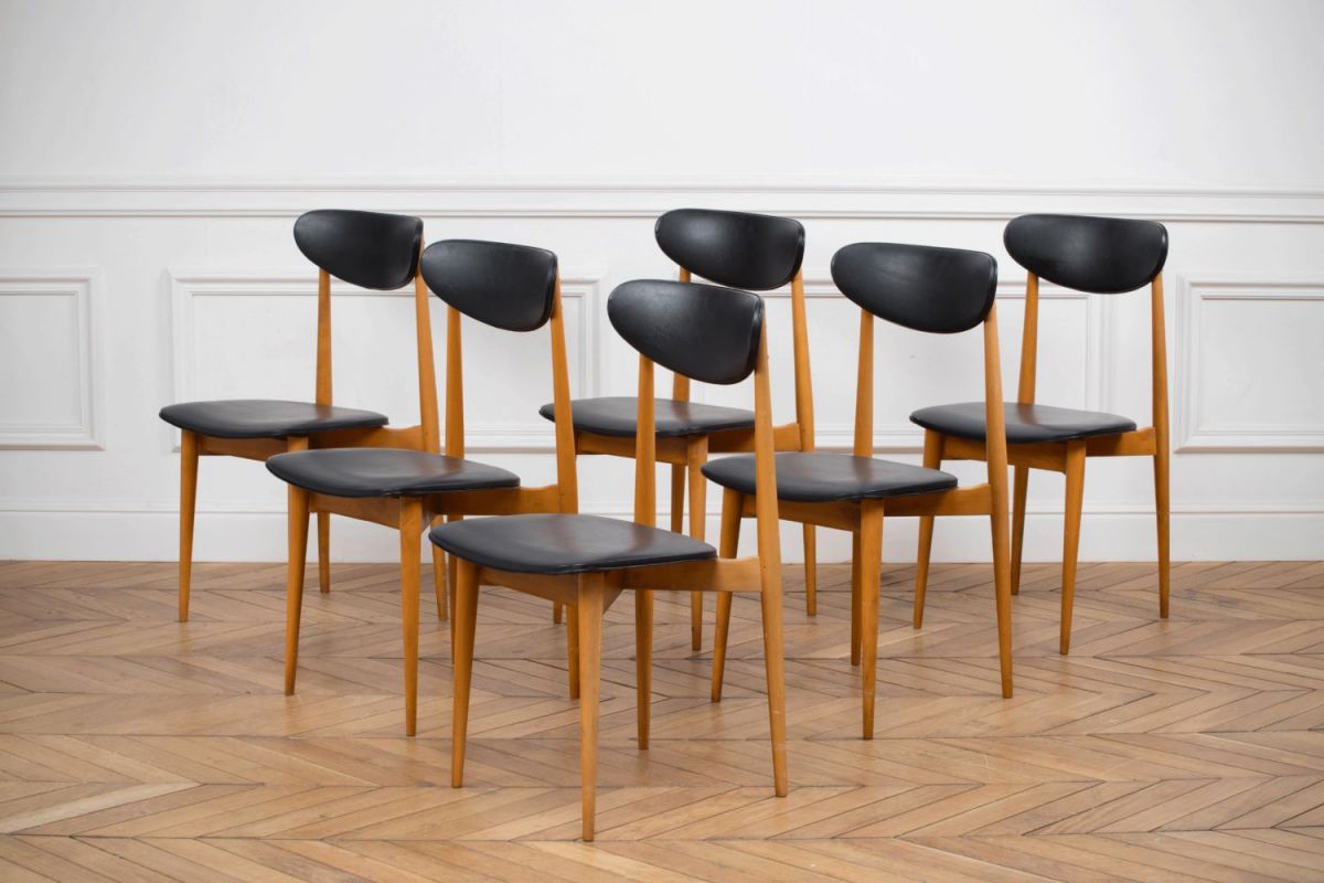 Série de 6 chaises vintage en chêne doré et skaÏ.
