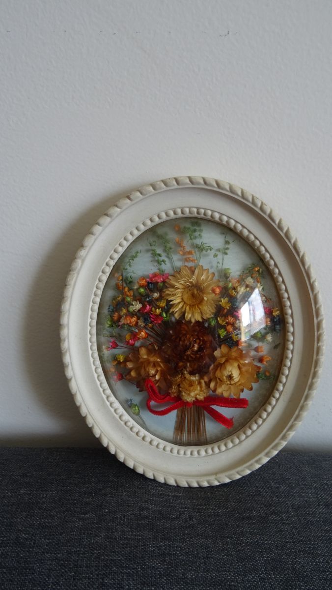 Joli cadre ovale bombé avec bouquet de fleurs séchées vintage