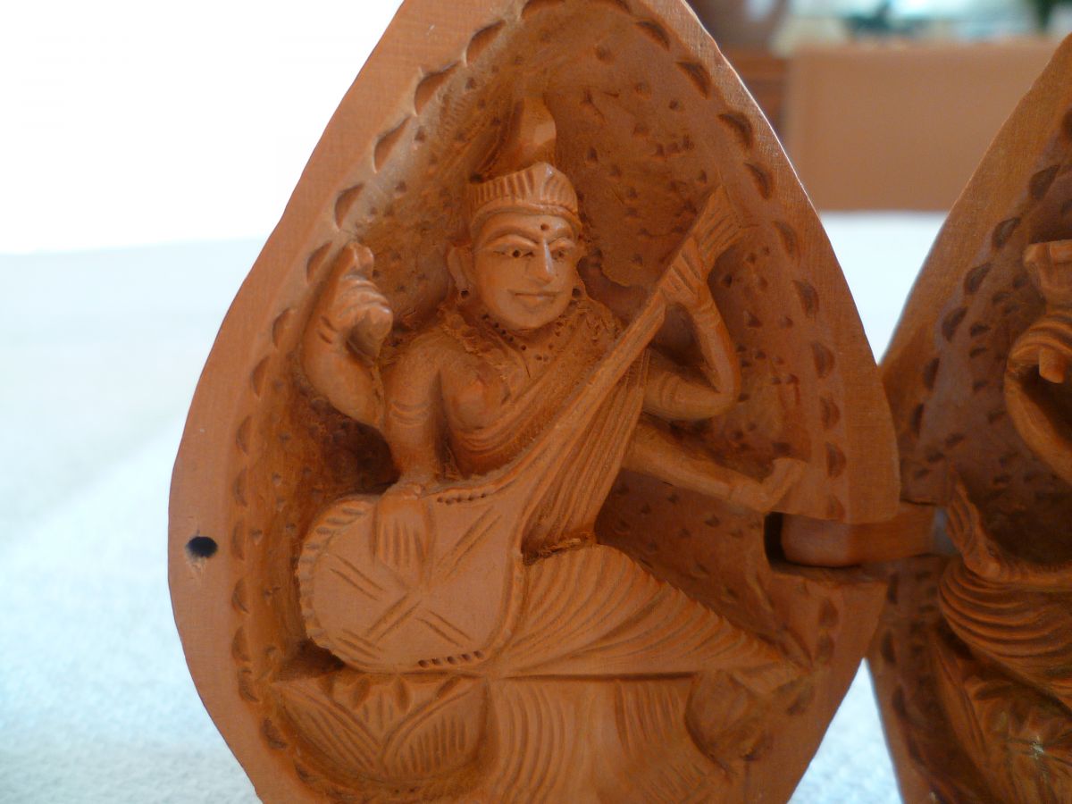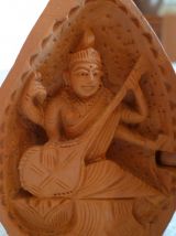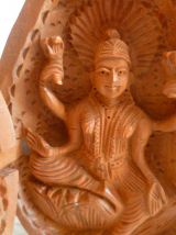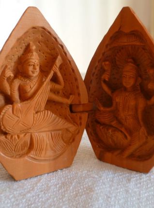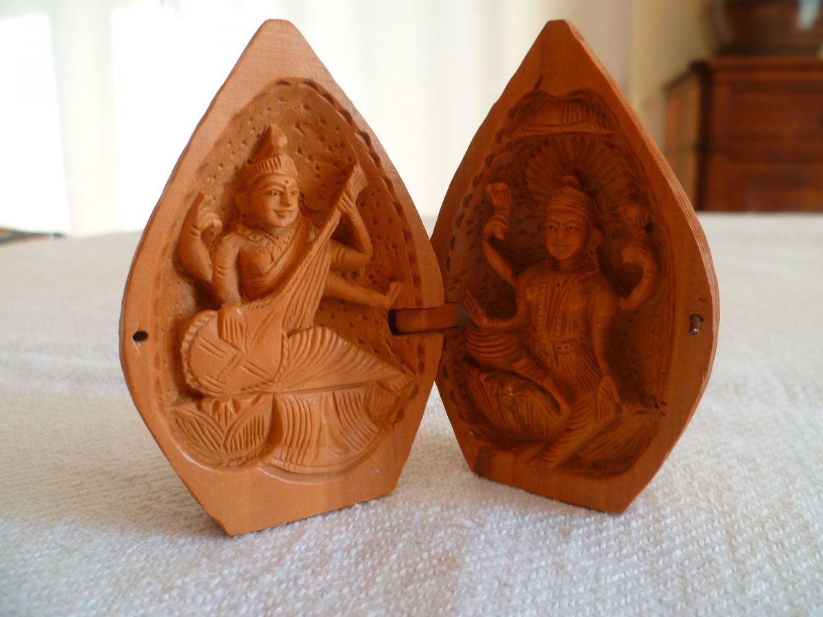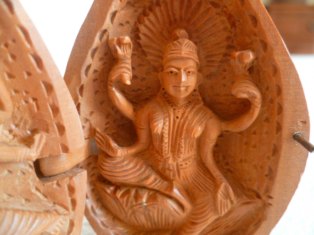 Autel temple bouddhiste portatif creusé et sculpté de deux déesses hindoues, vintage, - Lakshmi, déesse de la beauté, la splendeur, la prospérité et la fortune, - Sarasvatî, déesse de l'éloquence, de la sagesse et des arts.