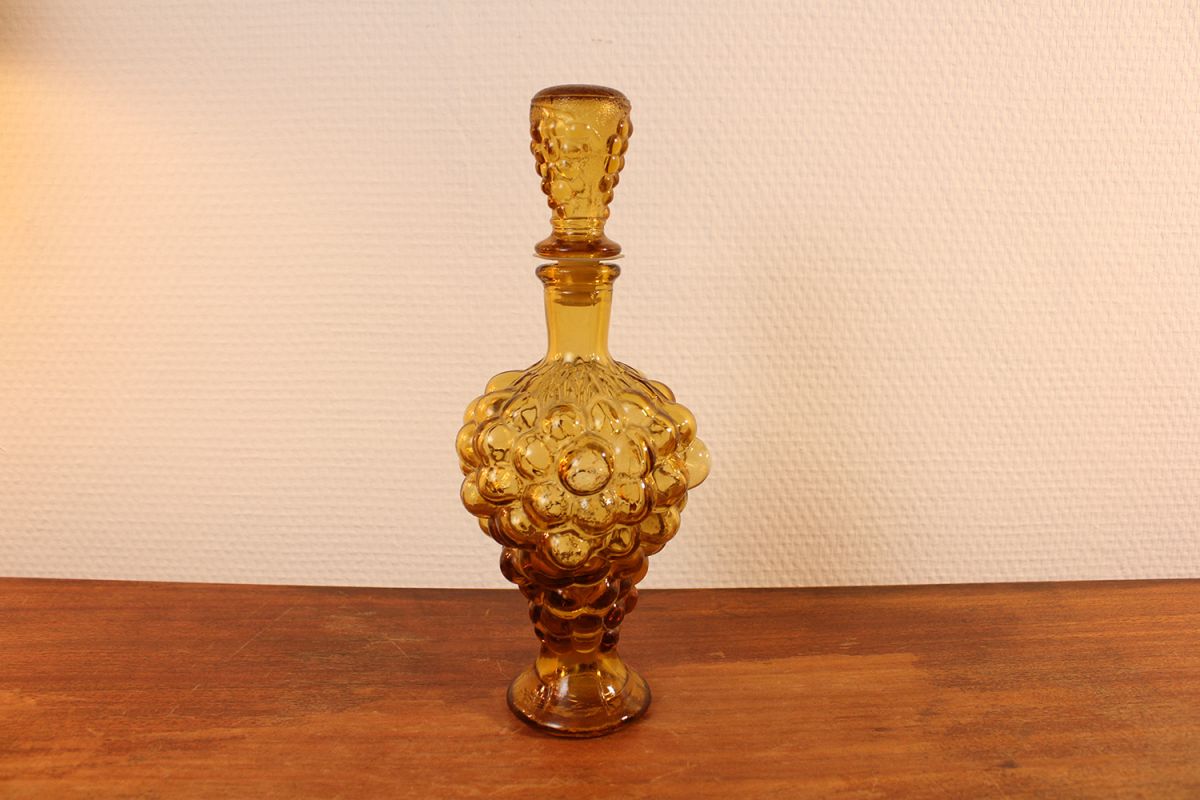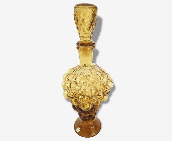Jolie bouteille en verre ambré, contenant initialement de l'alcool. Sa forme grappe de raisins peut faire un bel objet de décoration vintage, ou peut être toujours utilisé pour contenir un liquide ou une boisson. Dimensions : 27 cm de haut avec bouchon