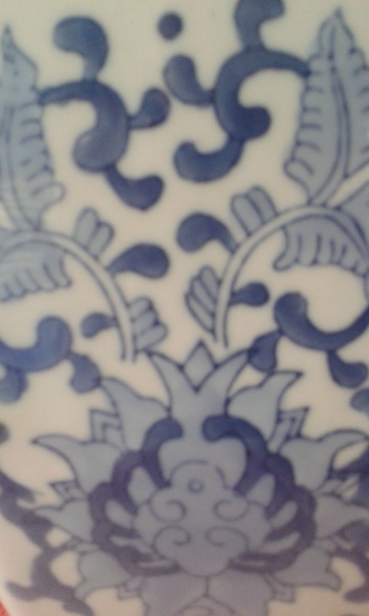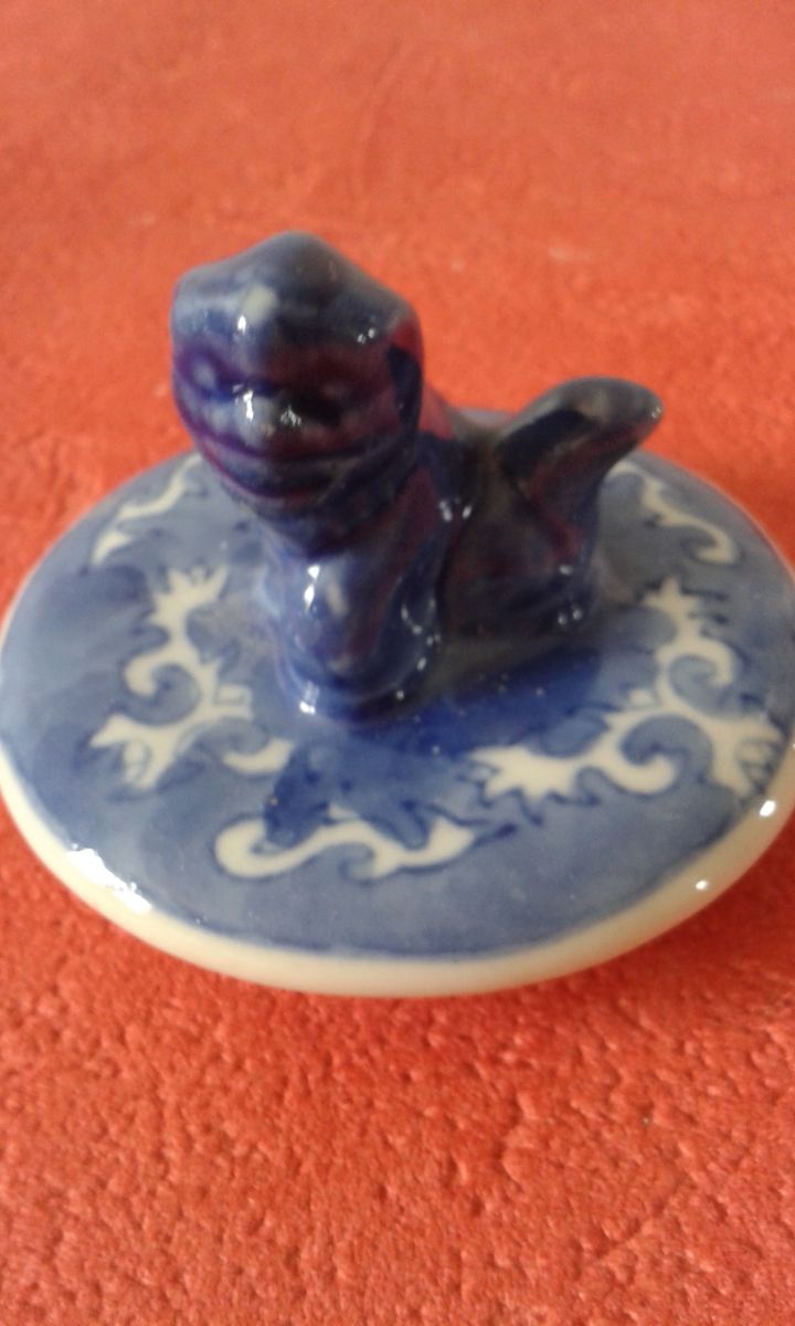 Grand pot décor bleu sur fond blanc avec couvercle sur lequel domine un e tête de lion.