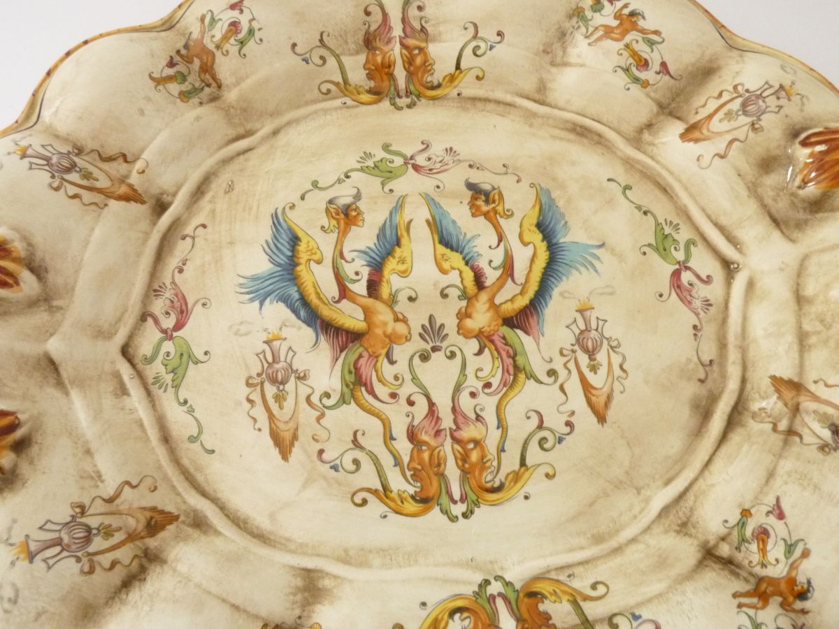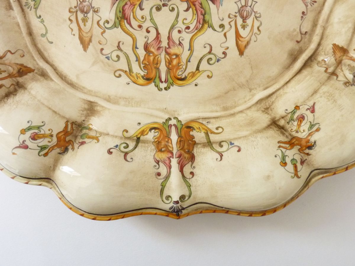 Très beau plat en céramique peinte à la main de la moitié du XXème siècle fabriqué en Italie. Plat richement décoré au décor animalier, bambins, floral.