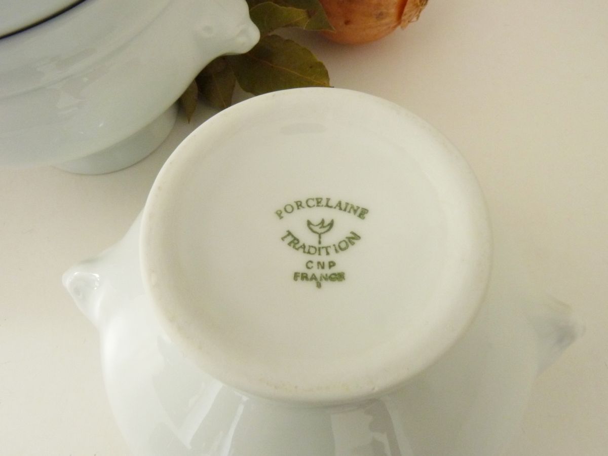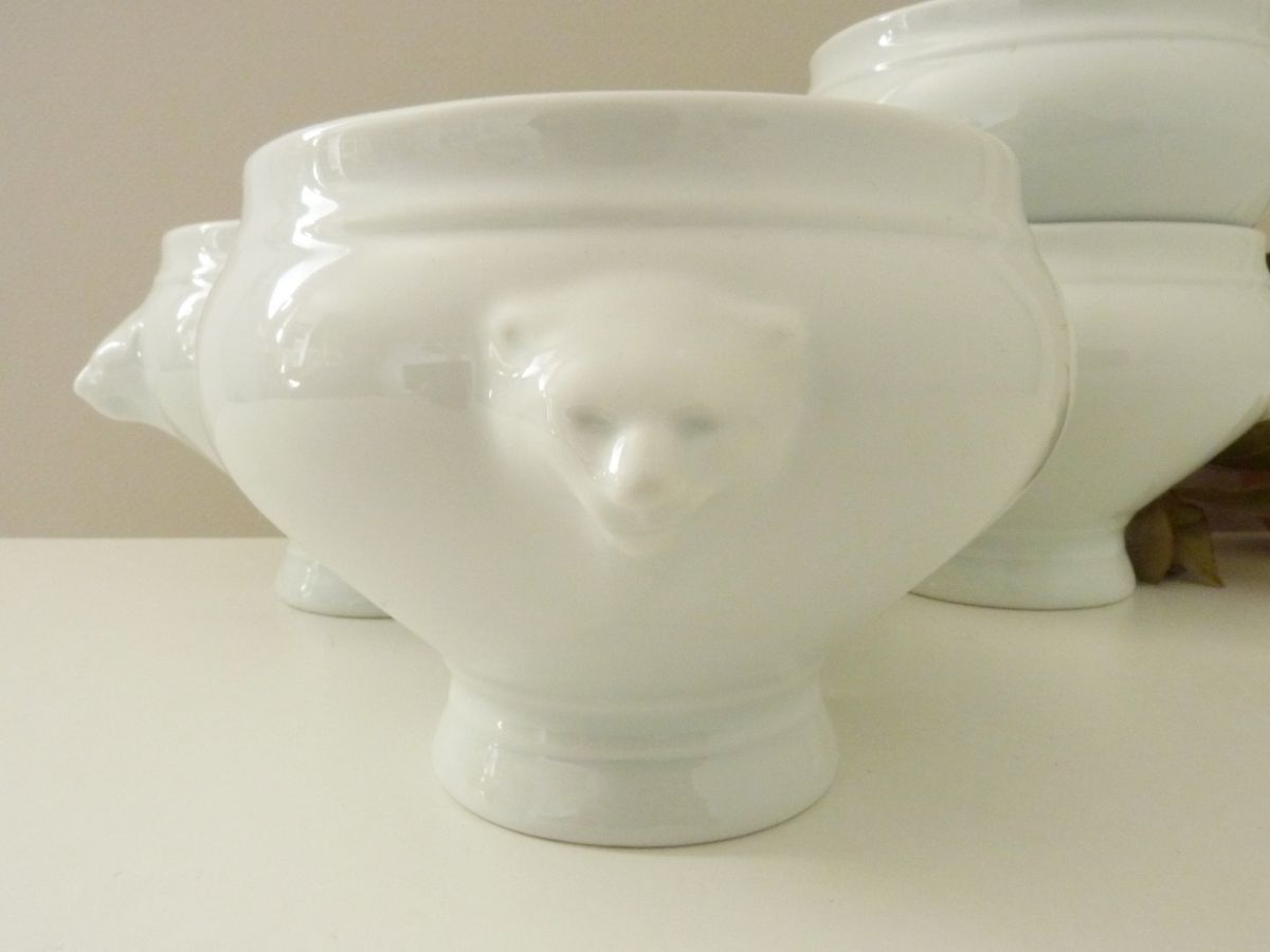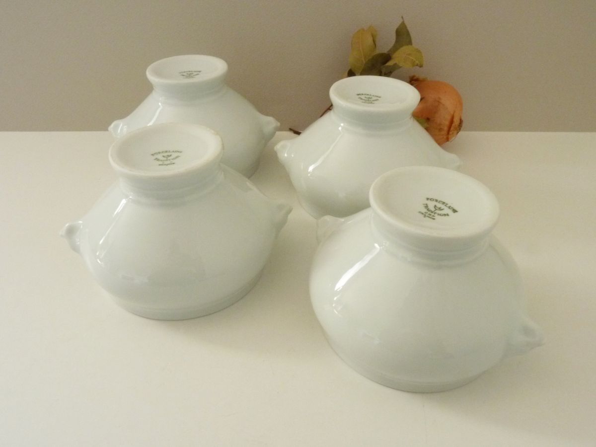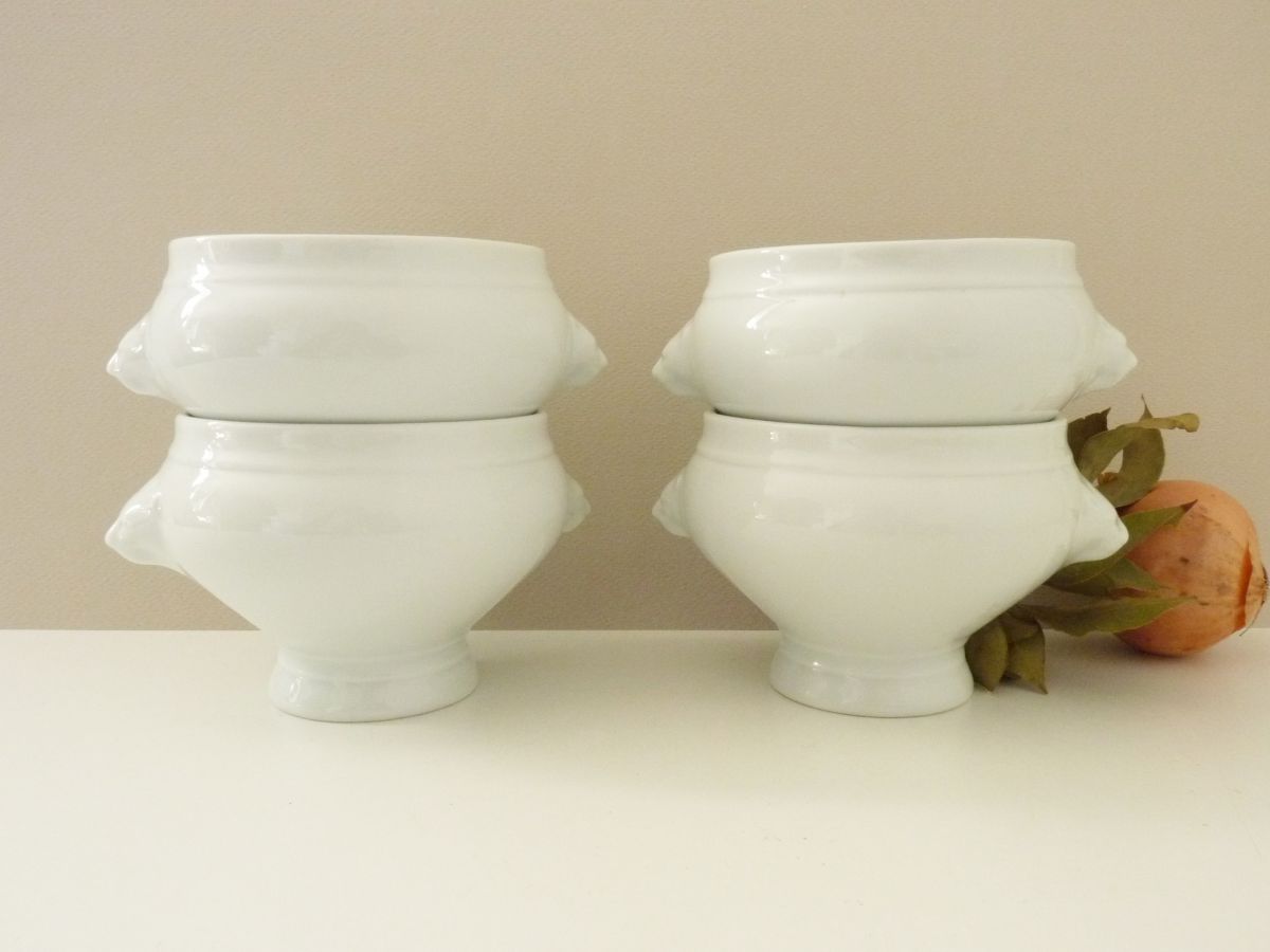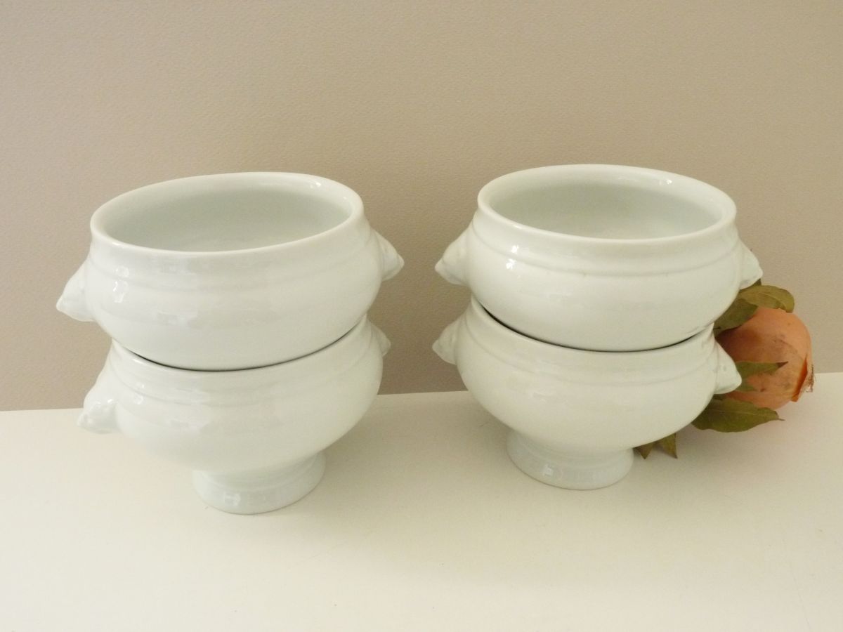 4 bols en porcelaine anses tête de lions, pour soupe à l'oignon. Porcelaine tradition CNP France