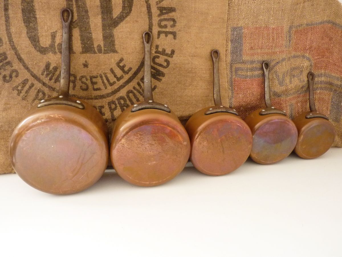 Lot de 5 casseroles française en cuivre massif étamé avec poignée en fer de la marque " Les Cuivres de Faucogney ". Vintage