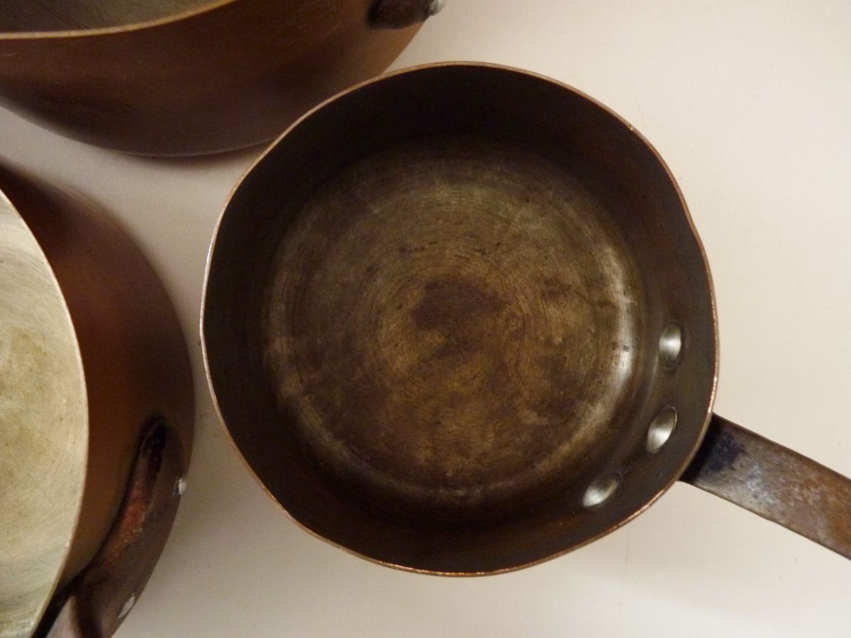 Les casseroles sont en bon état général mais dans leurs jus, mérite un nettoyage. Le cuivre présente juste quelques rayures superficiel. L'intérieur est en léger état d'usages. Pas de rouilles sur les manches.