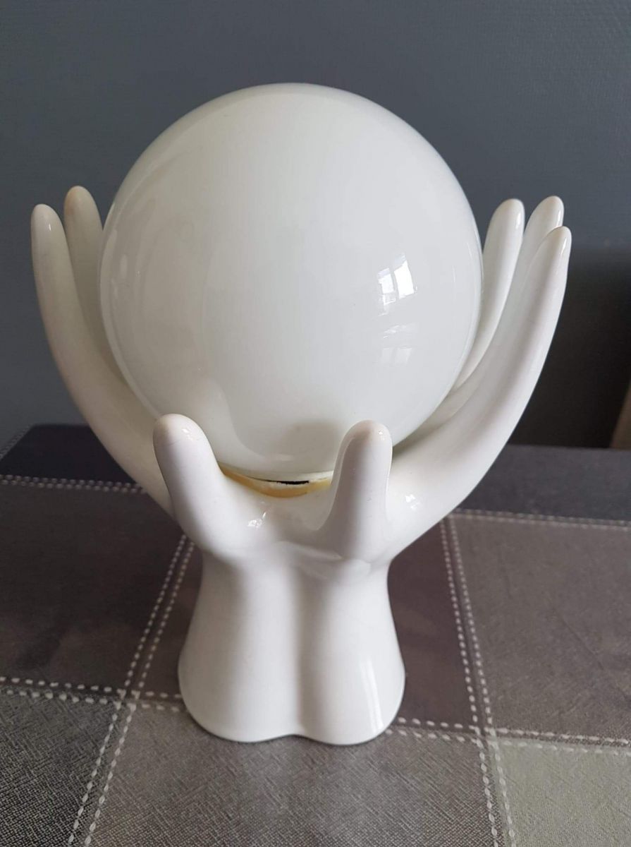 lampe en forme de mains en céramique blanche avec globe en opaline