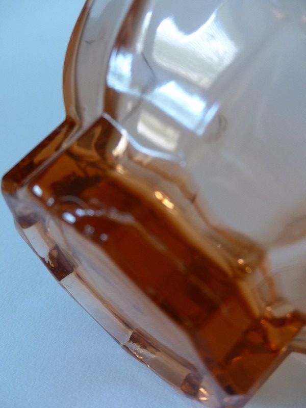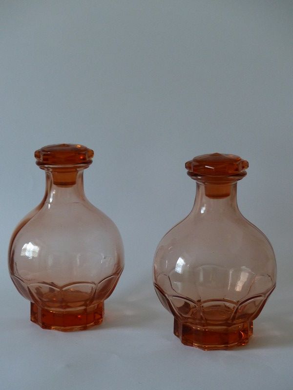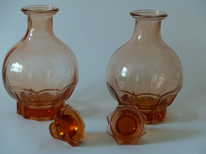 Lot de 2 jolies petites carafes en verre rose. Bouchons octogonaux à facettes. L' une a un petit éclat sur le pied mais ne fuit pas. Hauteur 19 cm. Ravissantes en petits vases pour des petits bouquets champêtres.