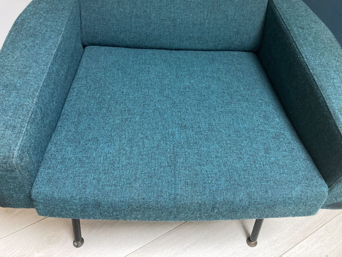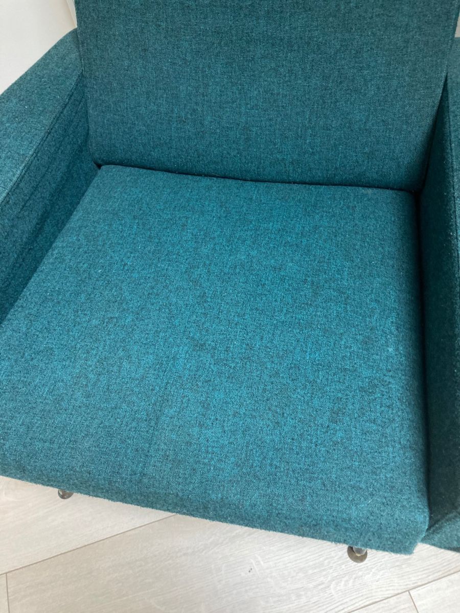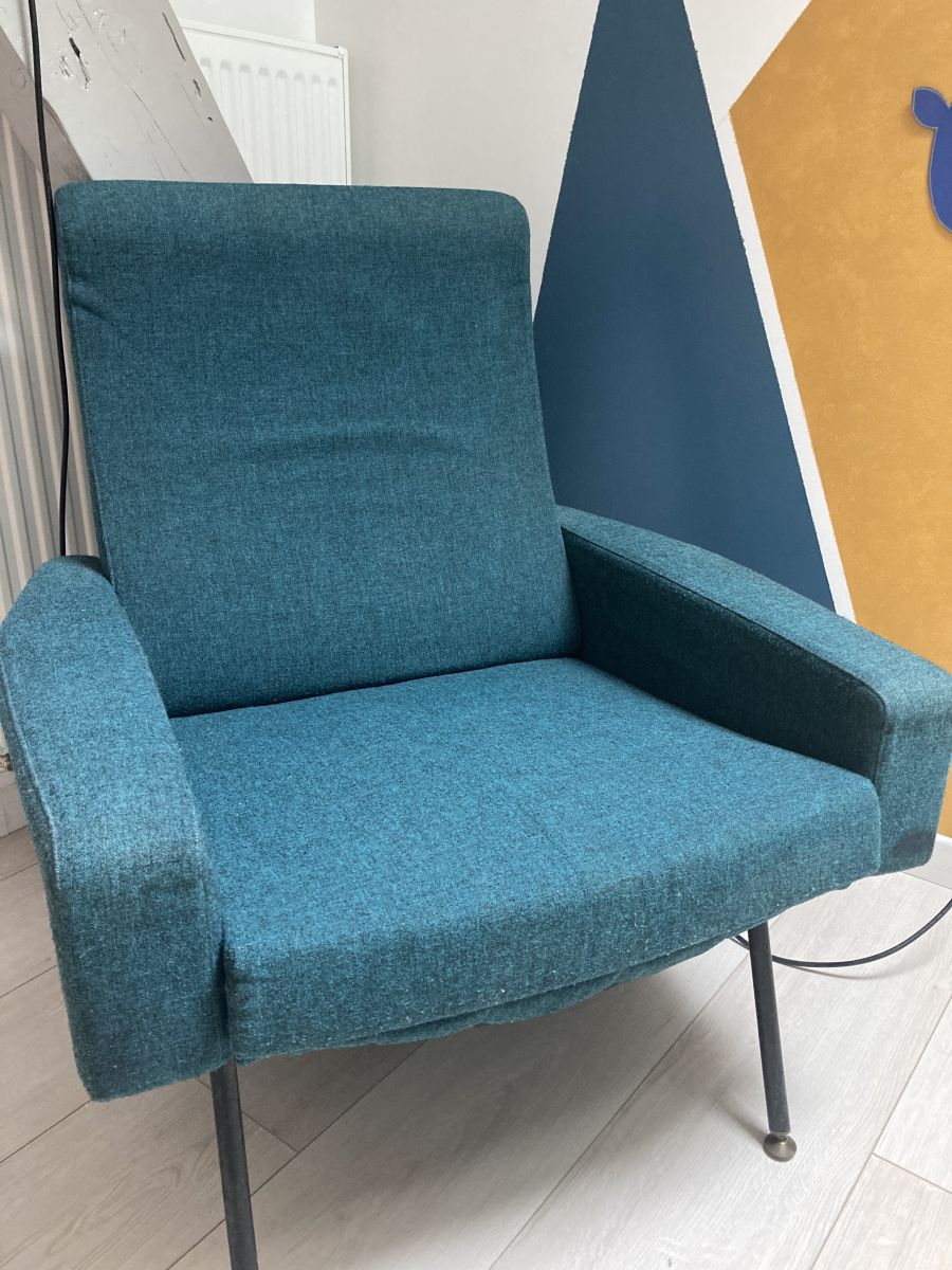 Fauteuil vintage "Troïka" dessiné Pierre Guariche, édité par Airborne dans les années 1950. Modèle estampillé entièrement d'origine. Structure en acier, système de ressorts Free-Span, garni de mousse et recouvert de tissu velours vert canard, piètement tubulaire acier chromé, rotules. État d'usage très correct ( tissus déhoussable ).