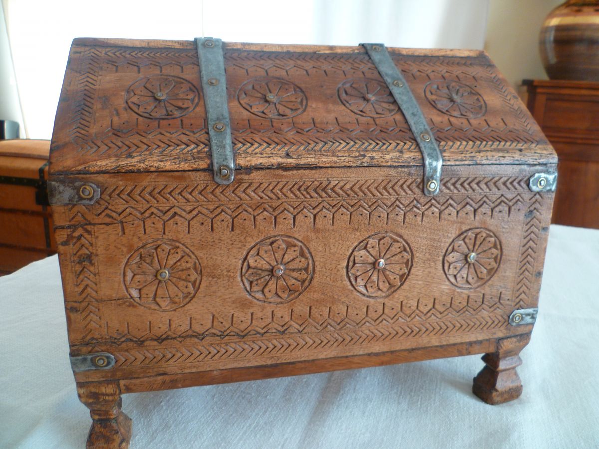 Coffre de mariage ramené du Rajasthan dans les année 1979 à 1981, longueur 32 cm, hauteur 30 cm, largeur 30 cm, 3,136 kg.