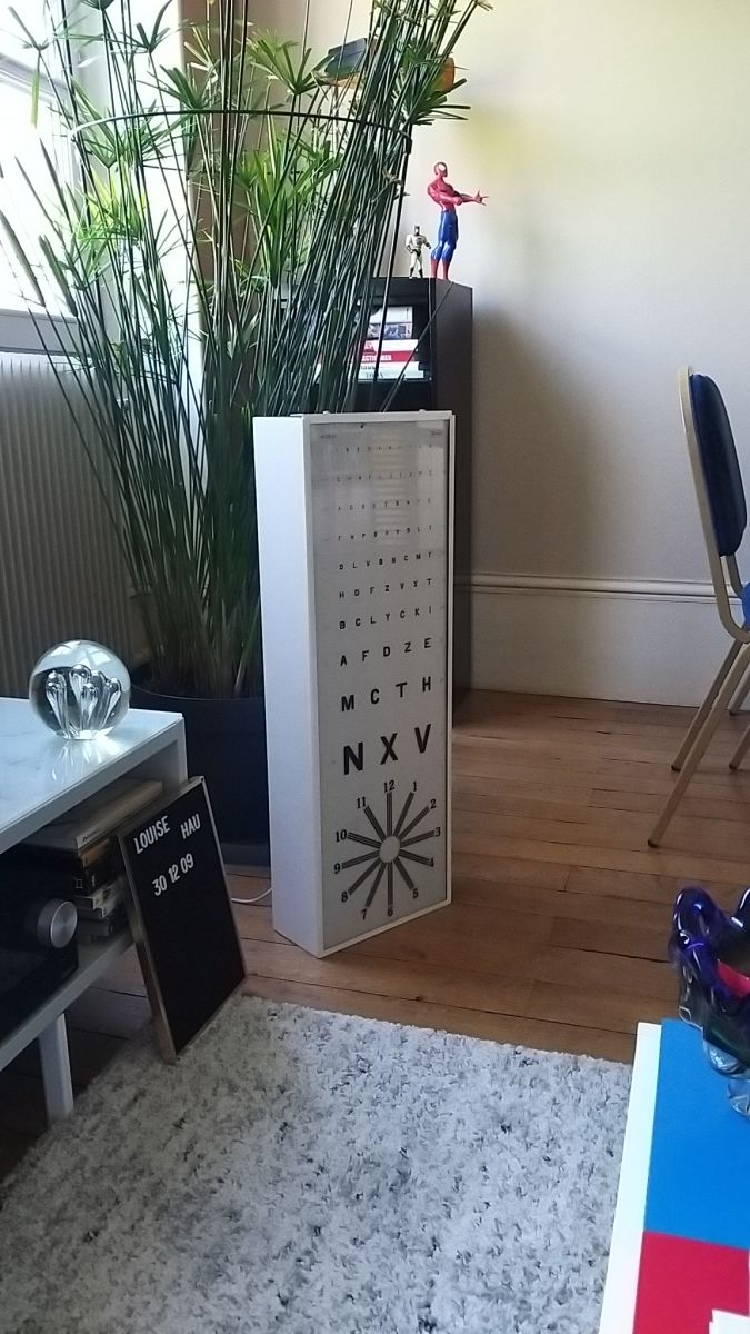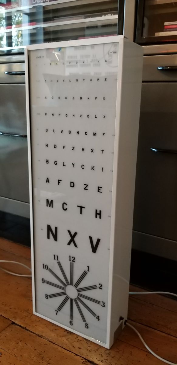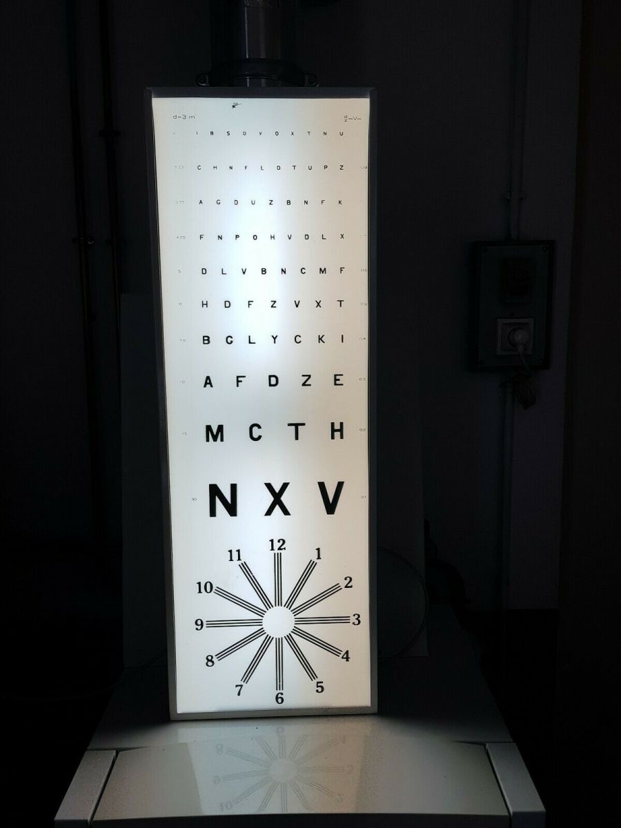Tableau standard lumineux composé d'un corps en métal supportant une plaque en plexiglas sérigraphiée de lettres et de chiffres composant l'échelle de mesure l'acuité visuelle (Monoyer), utilisé chez l'occuliste, l'ophtalmologiste ou l'opticien.