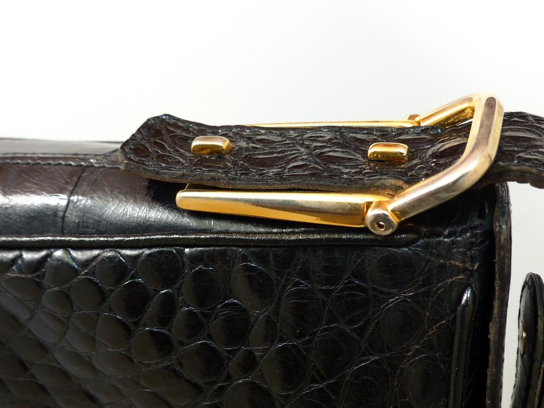 Magnifique sac croco vintage en cuir noir, excellent état. 2 poches intérieures latérales + 1 avec fermeture éclair. Intérieur comme neuf. Lanière d'épaule réglable. Rare et bel objet, surtout en si parfait état