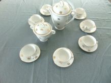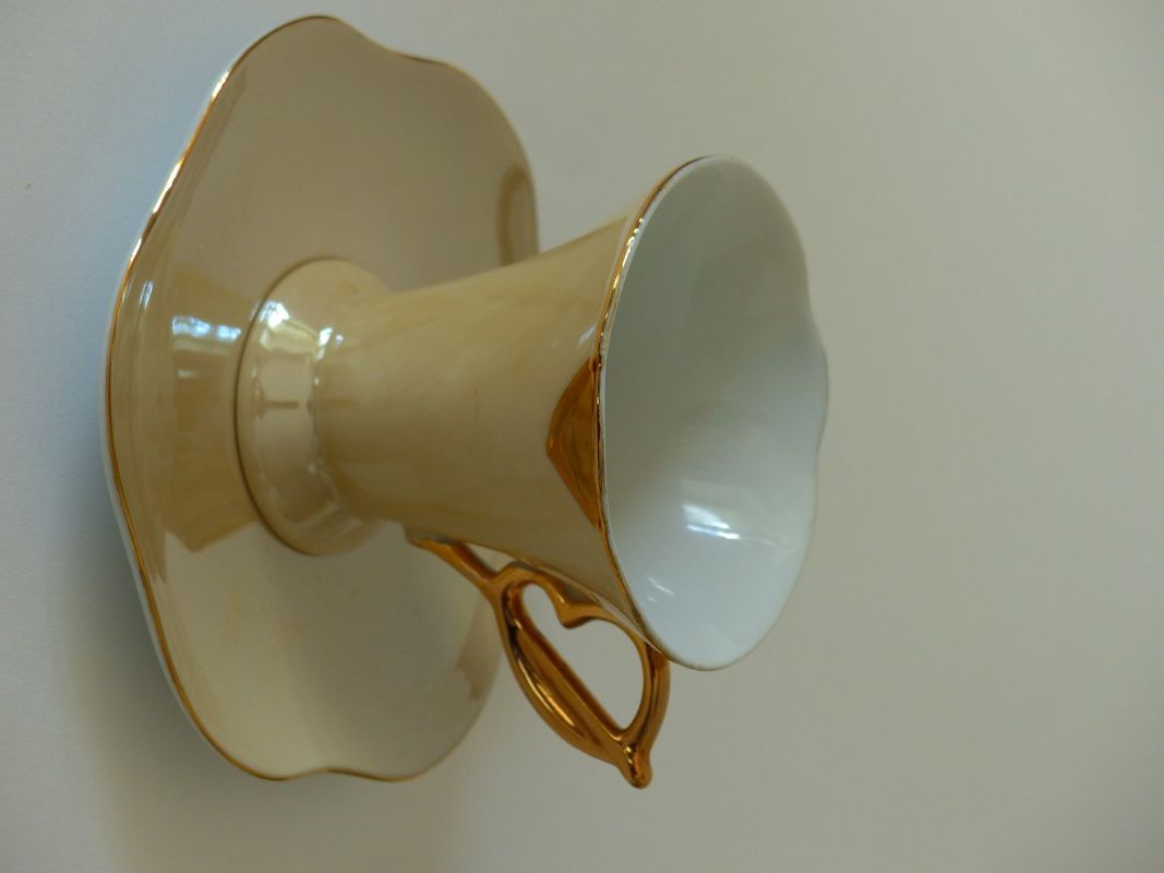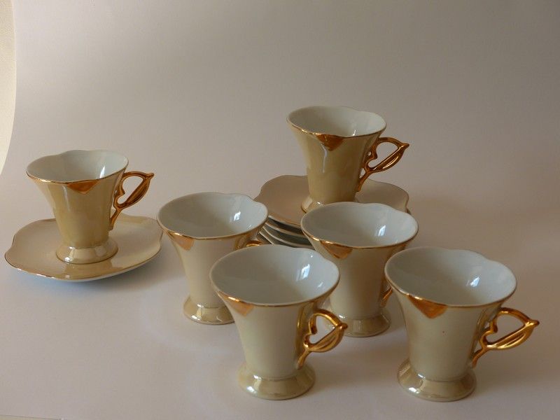 6 ravissantes tasses à café vintage nacrées et dorées en porcelaine. La soucoupe évoque une fleur épanouie. Hauteur 7 cm