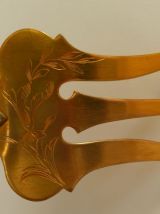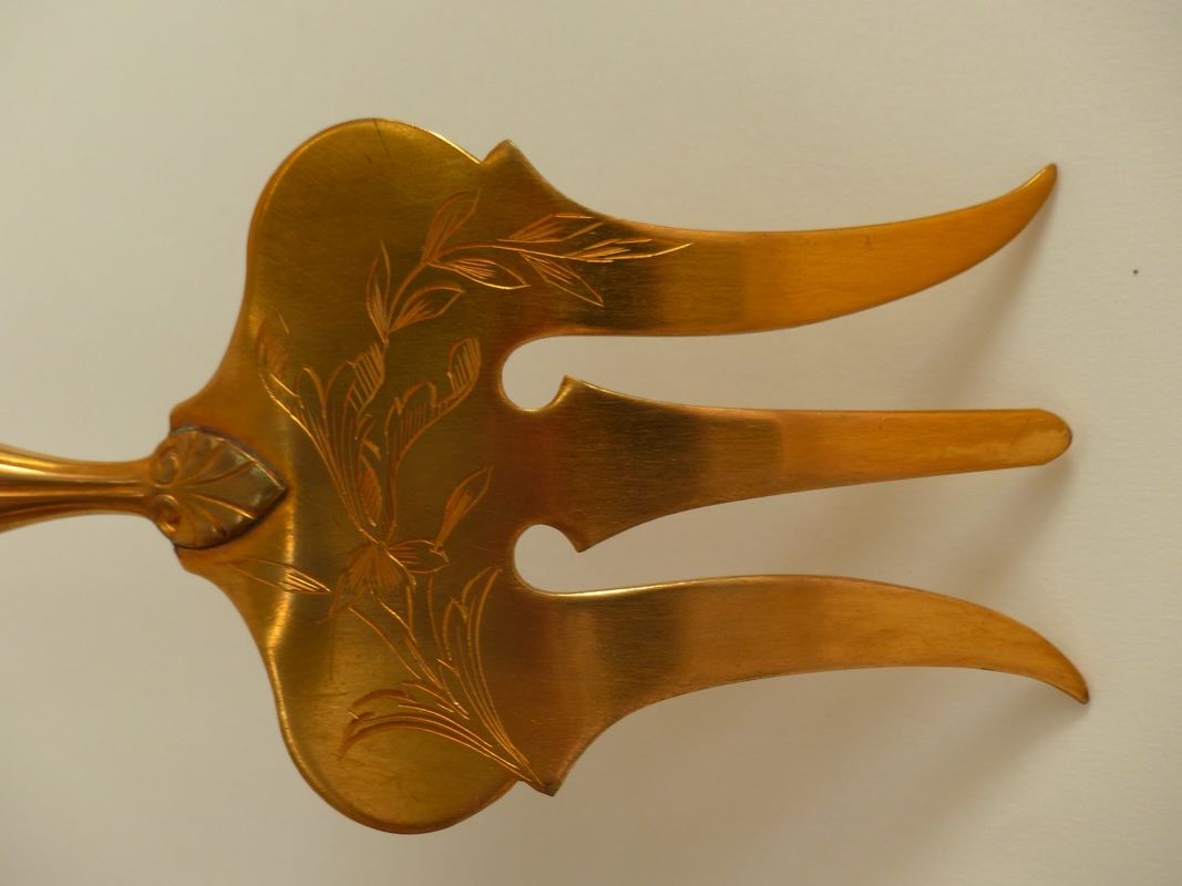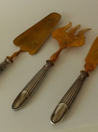 Ensemble de 3 couverts de service en métal argenté. Motifs gravés sur la lame du couteau, la pelle à tarte et la fourchette.