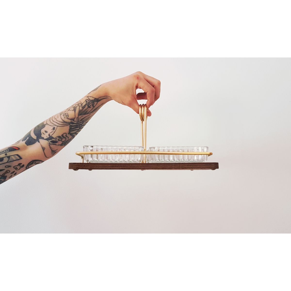 Le set aperitif mesure 29 cm sur 22 cm. Il est en laiton et formica.