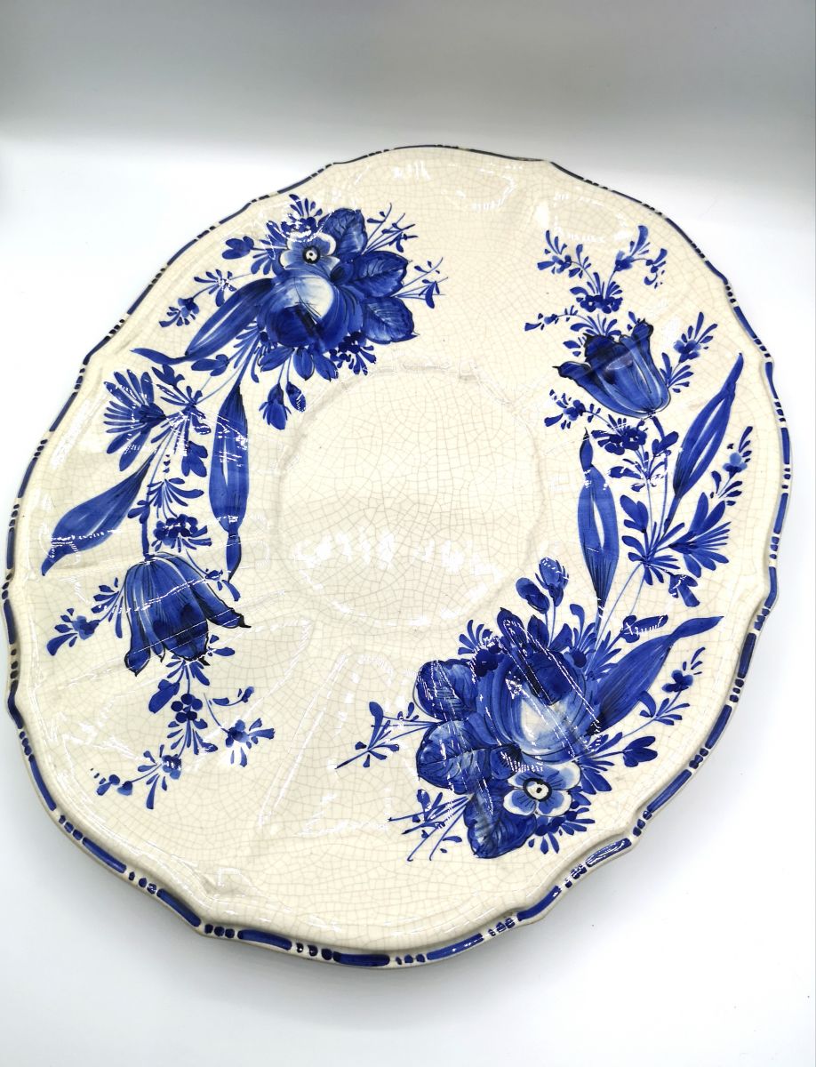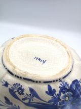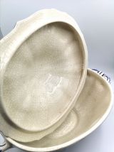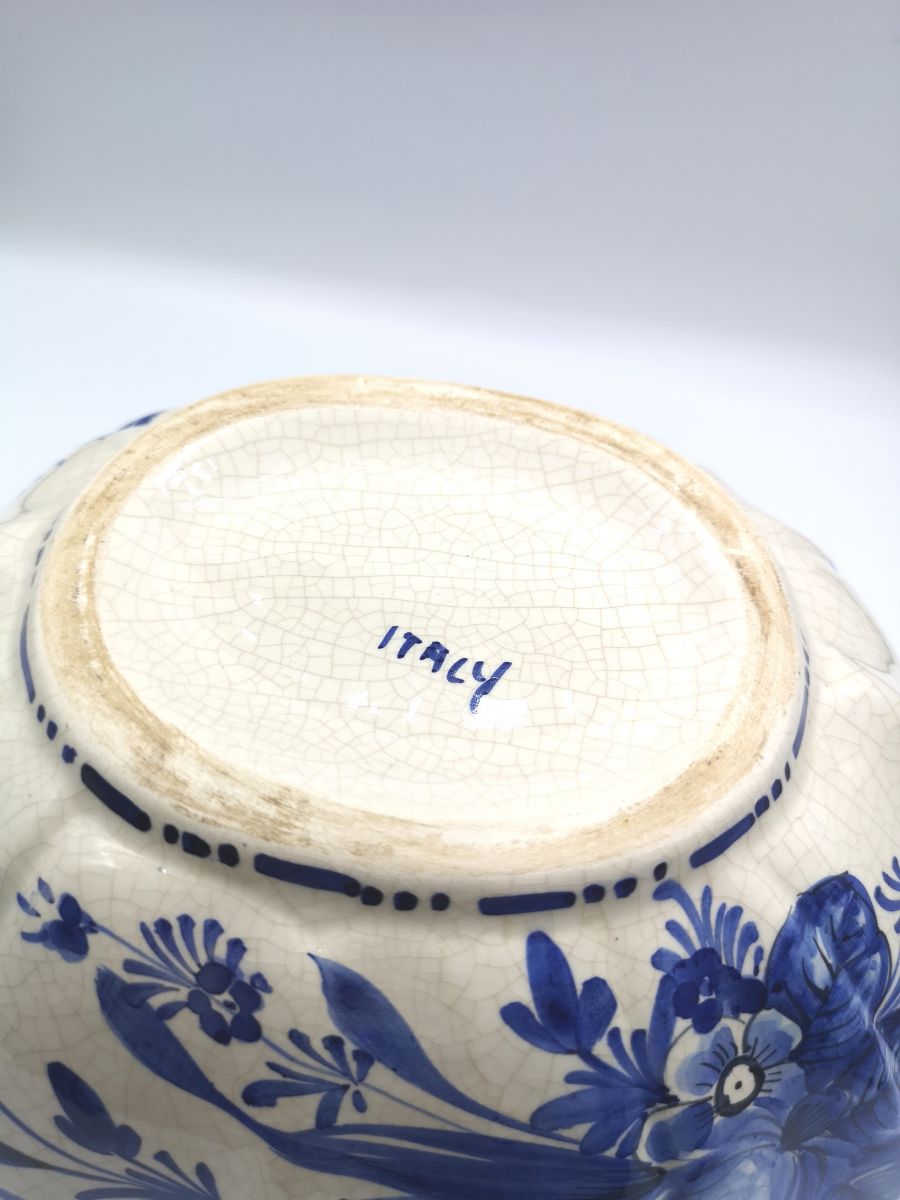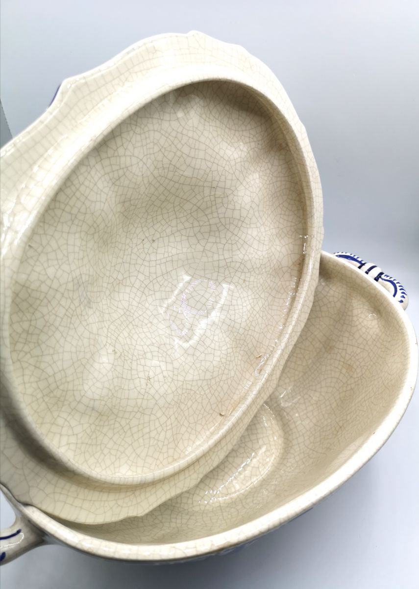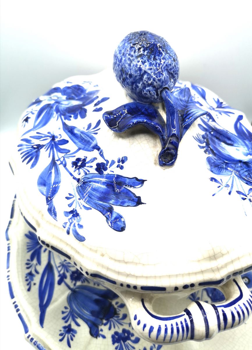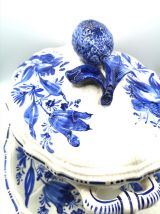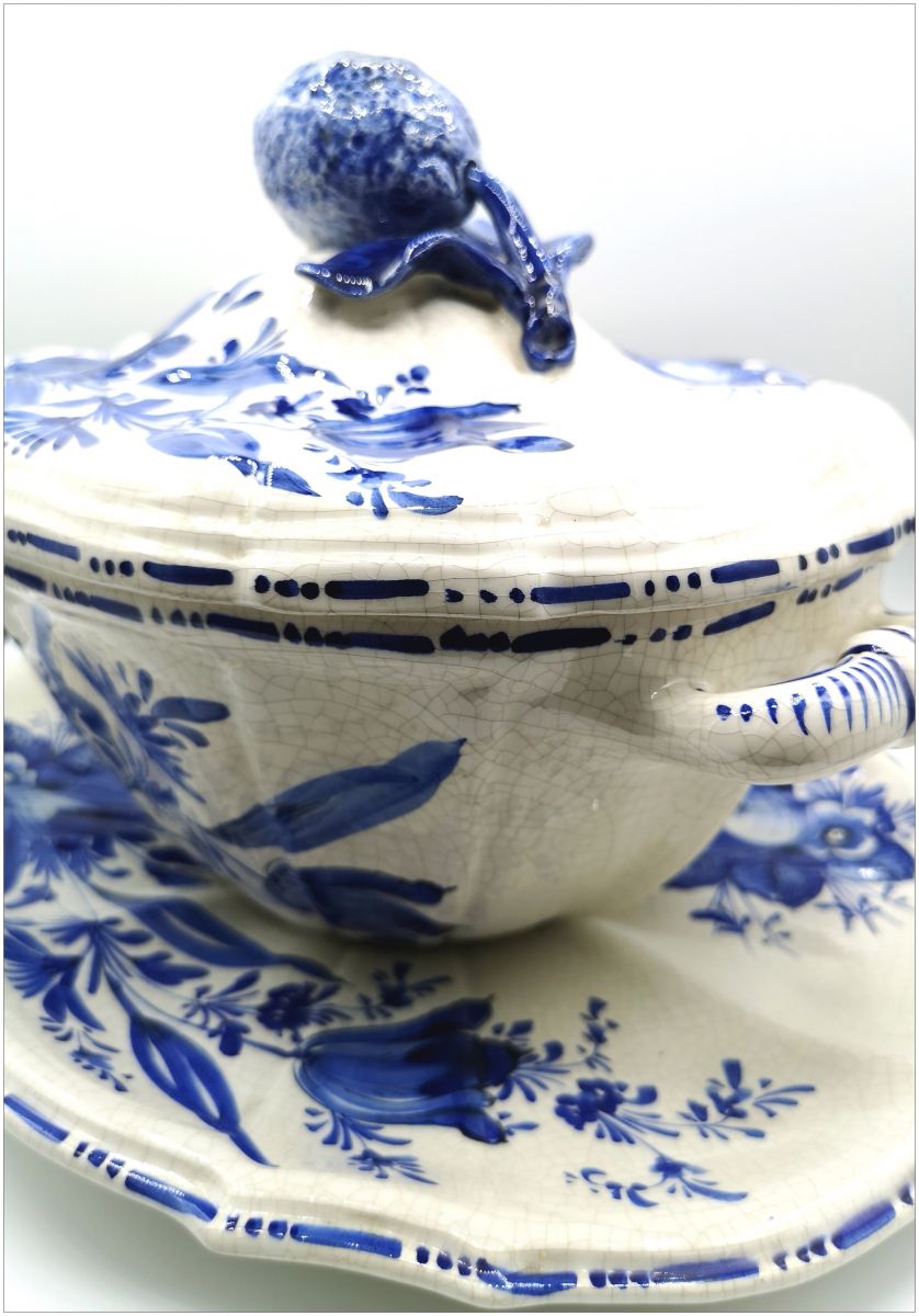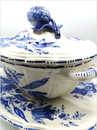 Grande soupière en céramique avec son plat assorti. Bleue et blanche, avec un citron en céramique en guise de poignée de couvercle, cette pièce n'est pas signée mais porte la mention Italy. Réalisée dans les années 60, cette céramique est assurément dans un esprit méditerranéenne, et trouverait sa place dans une maison de campagne ou une grande pièce lumineuse. Pourquoi pas détournée en grand vase pour recevoir une brassée de genêts ou mimosa.