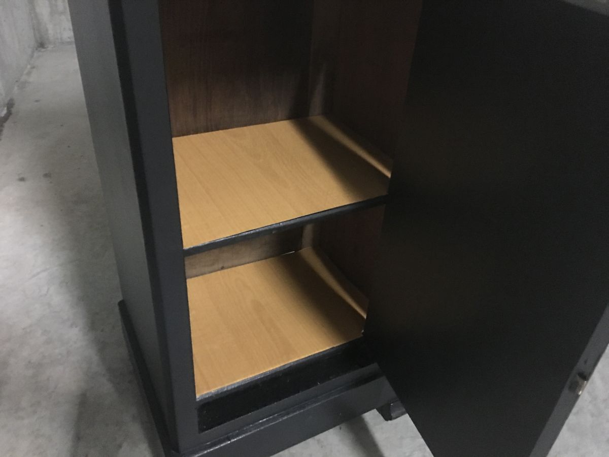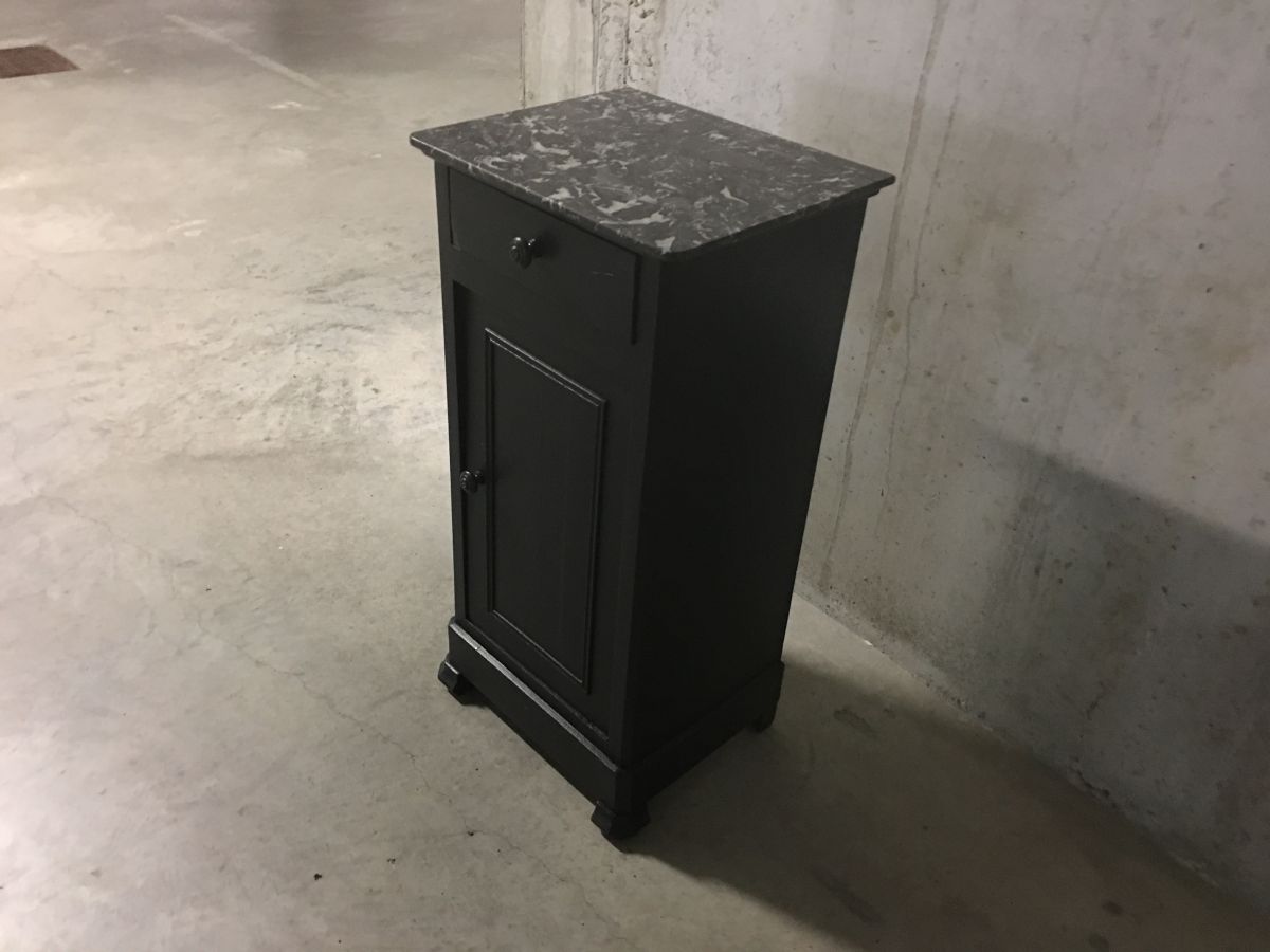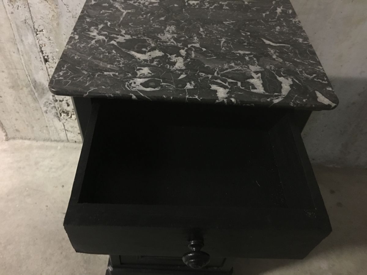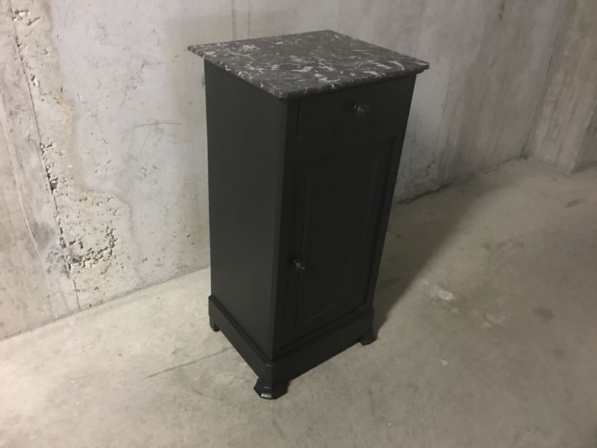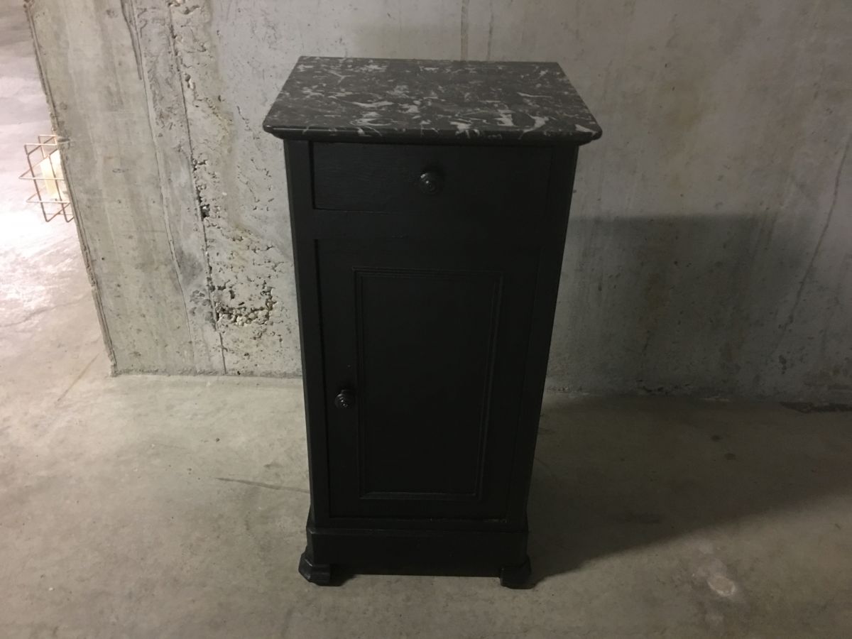 Très beau chevet en bois de style Louis Philippe, plateau en marbre noir, entièrement repeint en noir profond, 1 tiroir, 1 porte avec étagère intérieure, idéal en petit meuble d’appoint, dimensions (cm) : L.38xH.78xP.33, bon état.