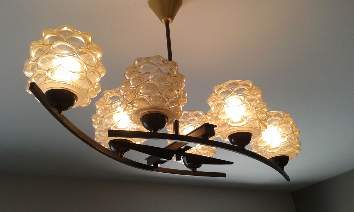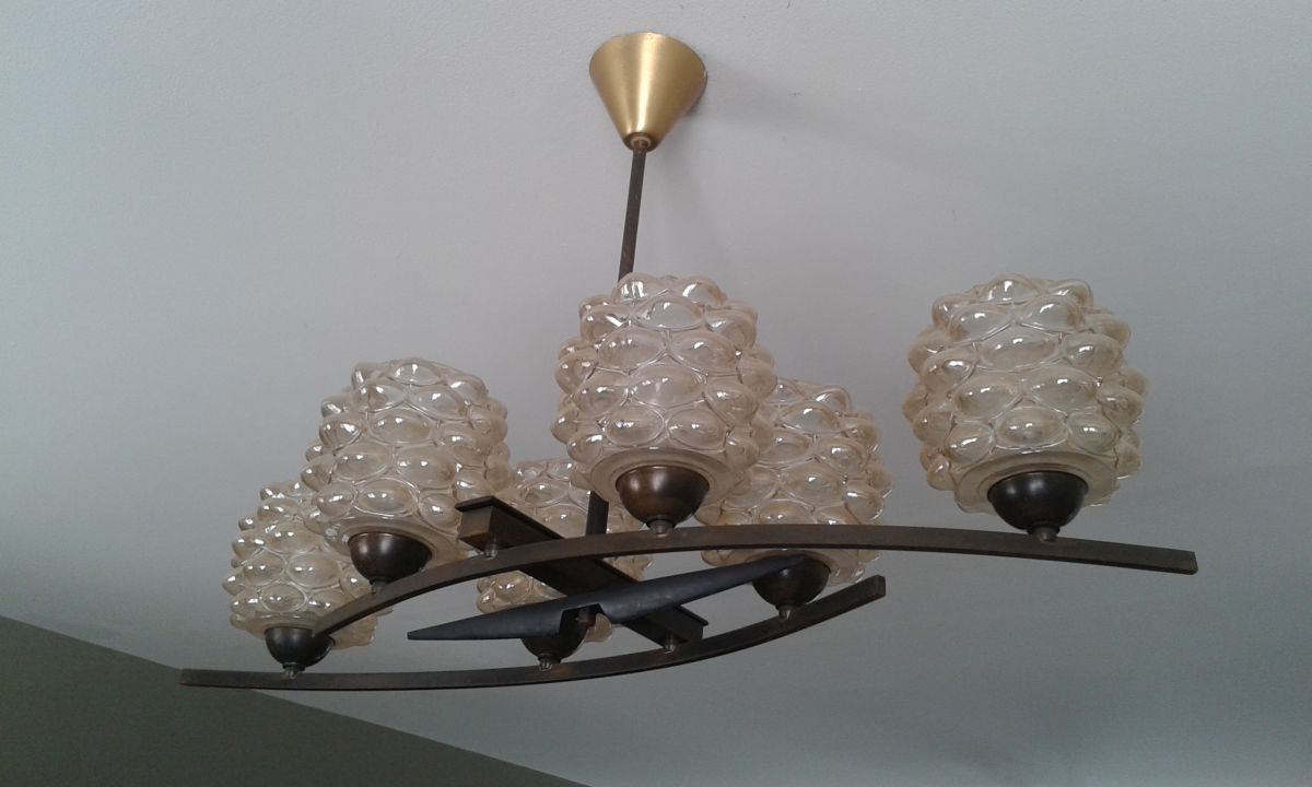 Lustre des années 60-70 composé de six globes en verre (style Arlus) montés sur une structure en métal noir.
