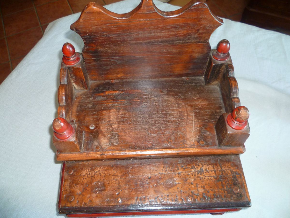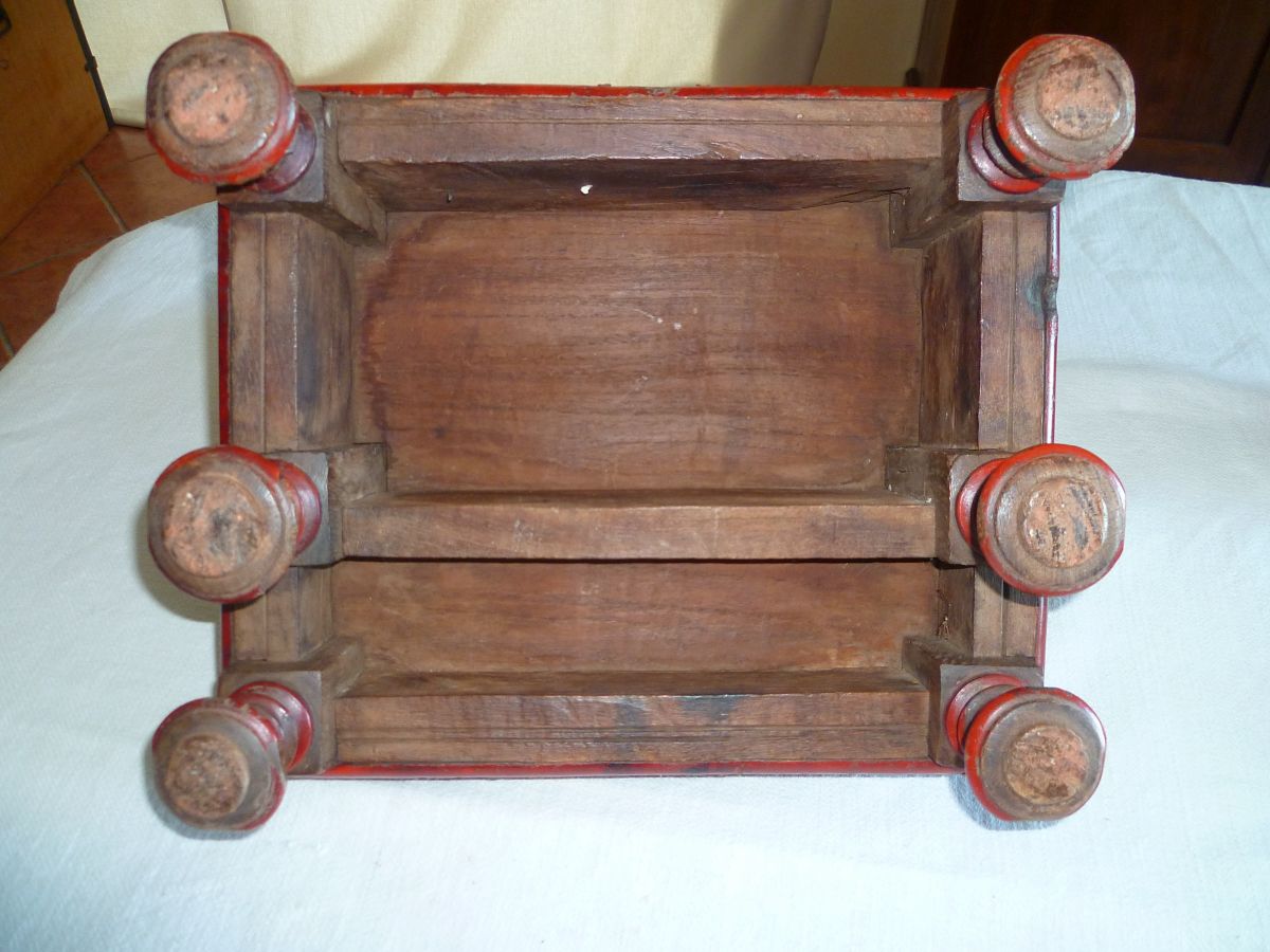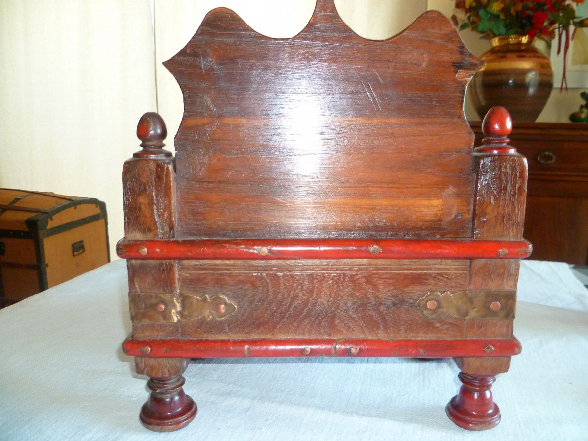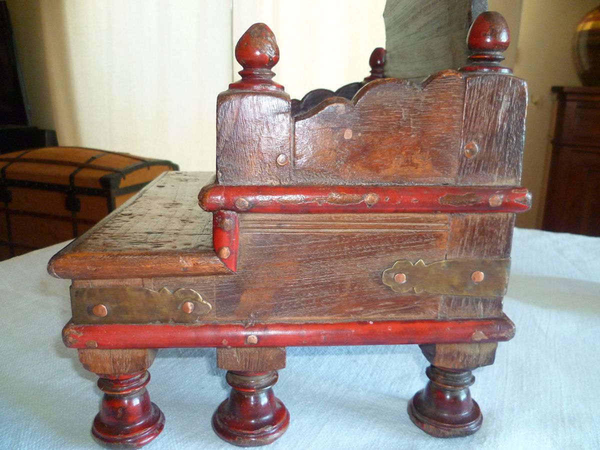 Autel temple bouddhiste domestique en bois, assemblé de pattes de laiton et rivets de cuivre, le charme des traces d'usage du temps passé. Vintage. 4,1 kg, largeur 35 cm, hauteur maxi 38,5cm, hauteur mini 15 cm, profondeur 29 cm.