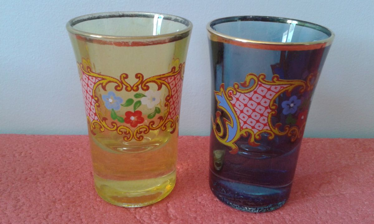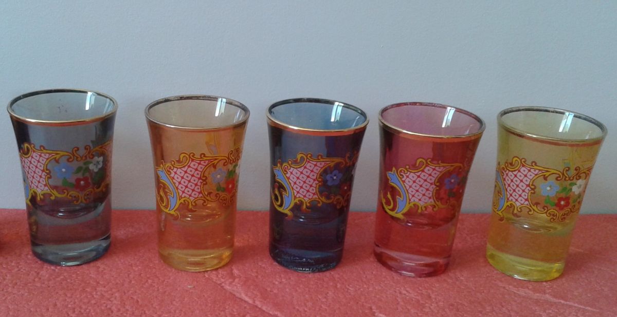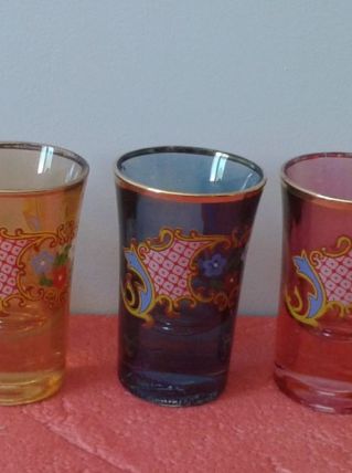 Cinq verres à digestif en couleur décorés.