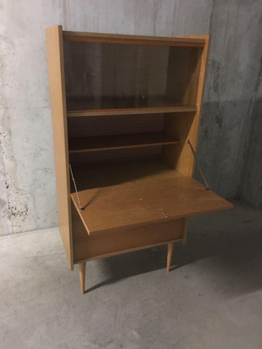 Magnifique secrétaire en bois blond des années 60, pieds fuseaux, 1 niche en haut avec 2 vitres coulissantes, 1 étagère intérieure dans l’écritoire, 2 portes battantes en bas avec 1 étagère intérieure, quelques très légères traces d’usage normal, entièrement nettoyé et passé au régénérateur de bois, superbe patine, très stable et solide, dimensions (cm) : L.74xH.148xP.40, bon état.