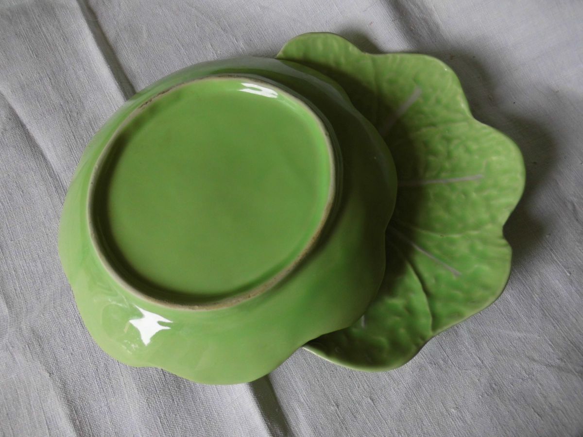 Jolies assiettes façon barbotine verte en forme de feuilles.