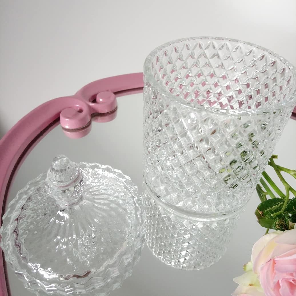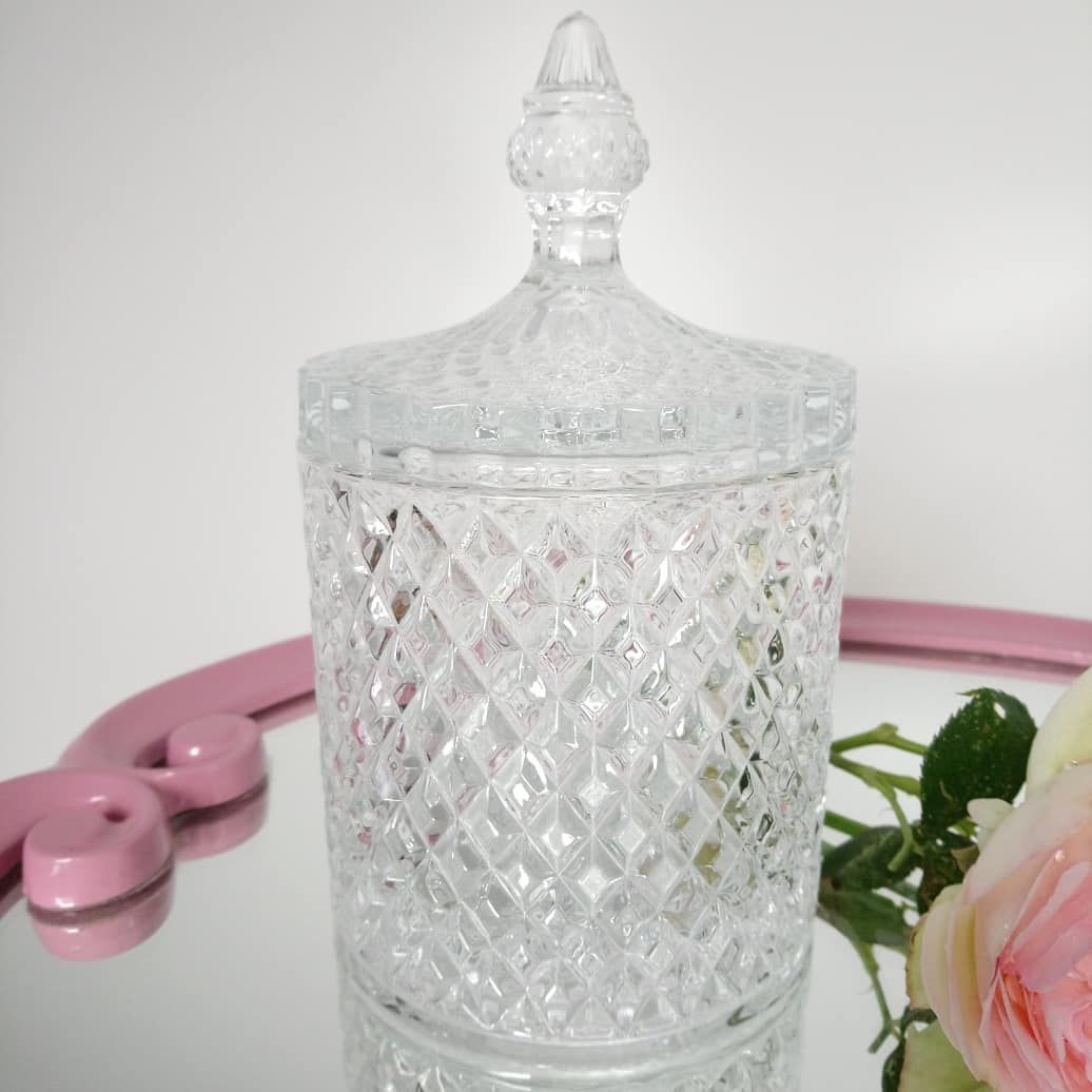 Bonbonnière, pot rond en verre ciselé façon diamant de grande taille très décoratif, elle trouvera sa place sur un joli buffet.