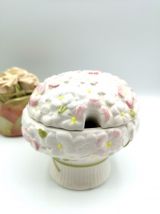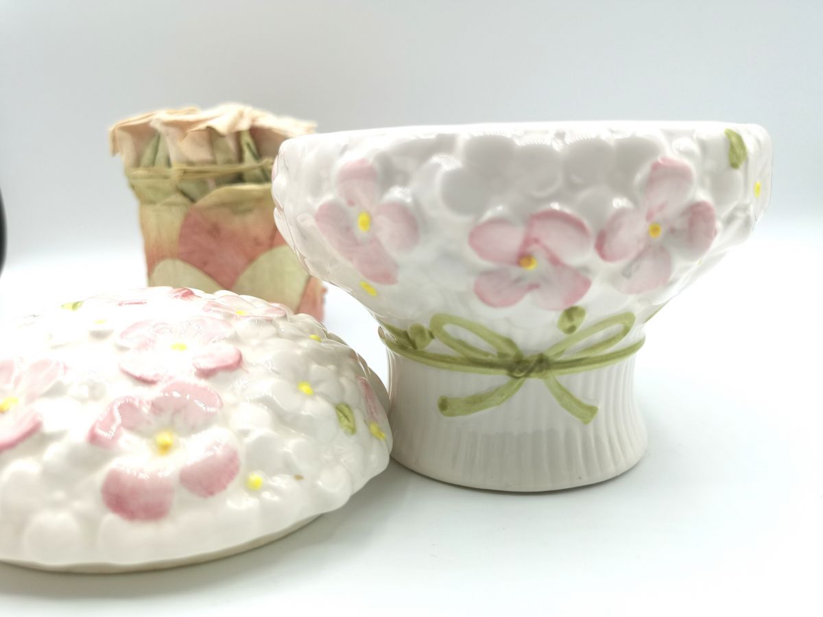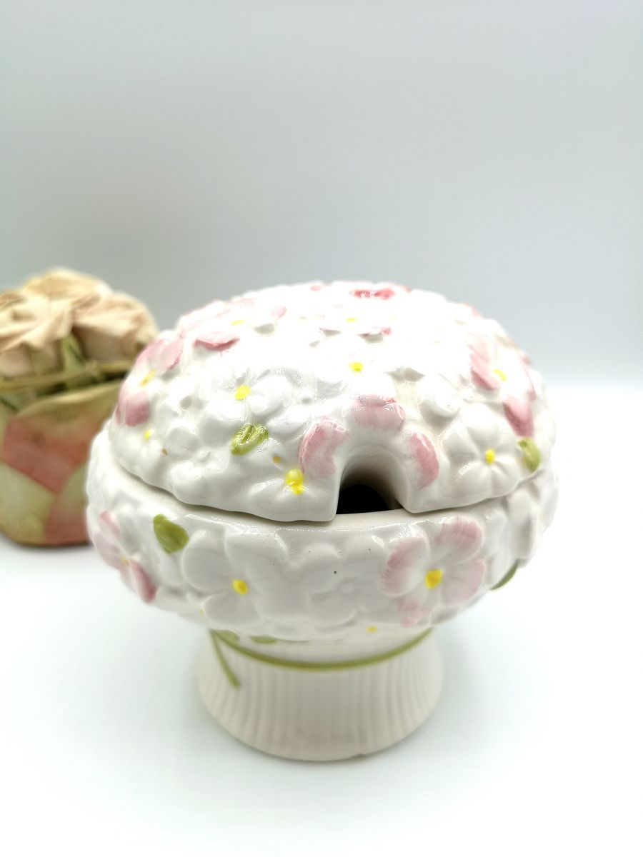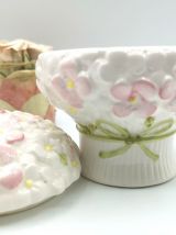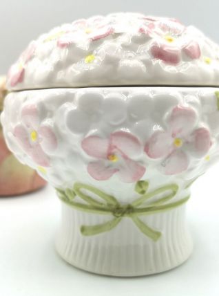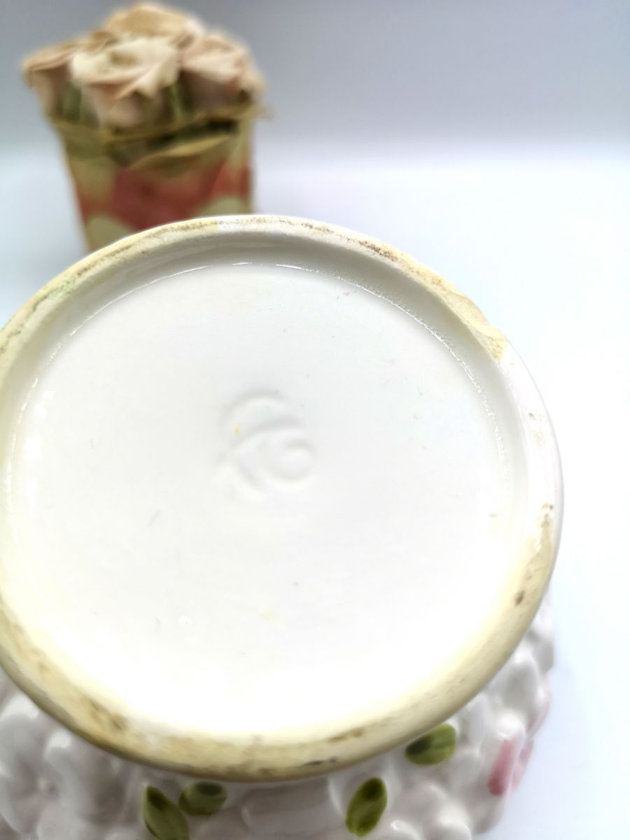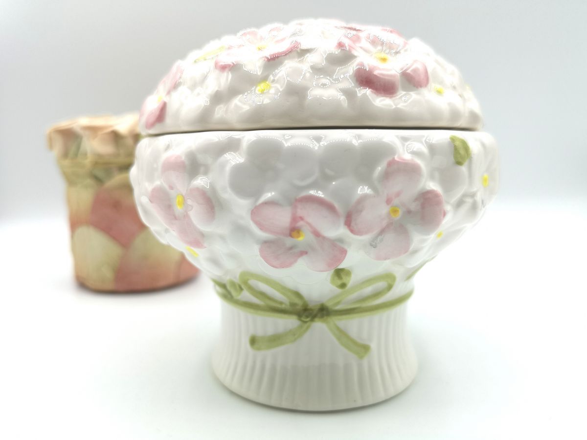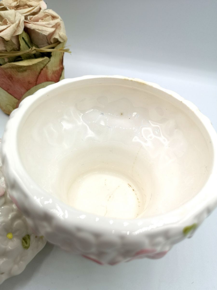 Très original, ce pot en forme de bouquet, parfait pour servir la confiture, le sucre, le sel, la moutarde..... Encoche prévue pour la petite cuillère. Le haut du bouquet s'ouvre en couvercle. Cet objet est en très bon état, un tout petit impact à la base mais ne se voit presque pas