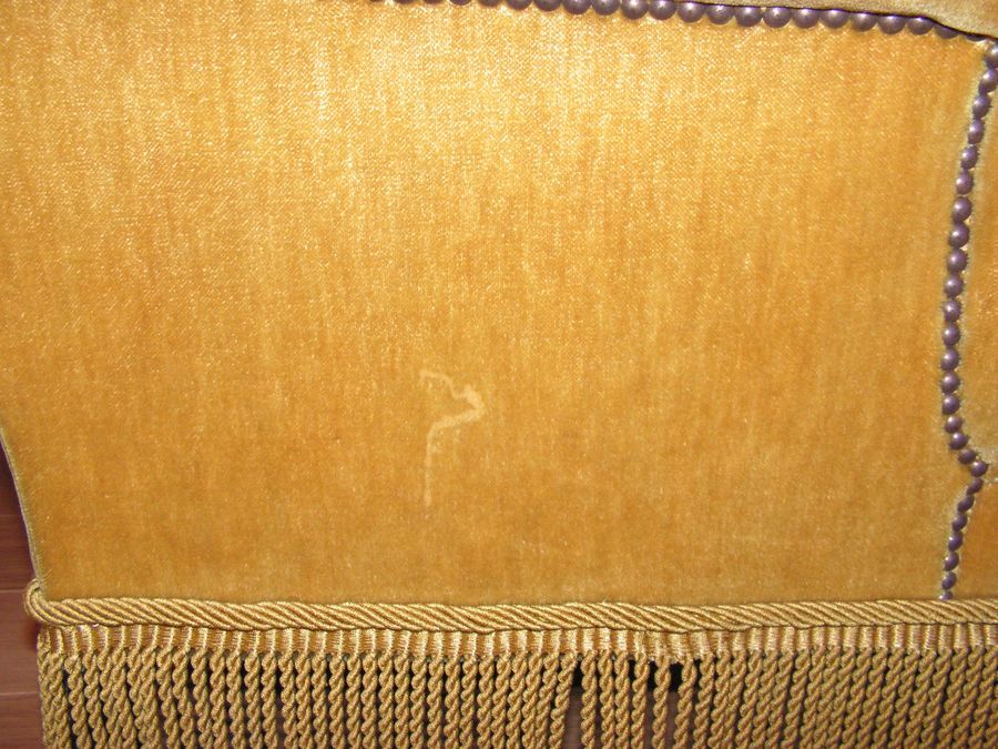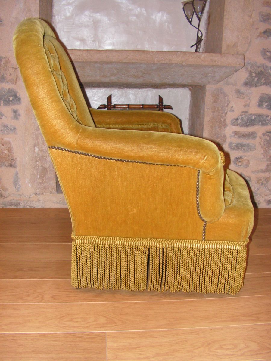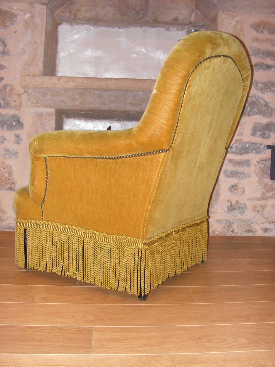 Magnifique fauteuil époque Napoléon III en velours capitonné riche garniture de passementerie, pieds en bois noirci agrémenté d'un anneau doré, bel état pour son âge, très belle pièce unique.Couleur jaune doré reflet olive.