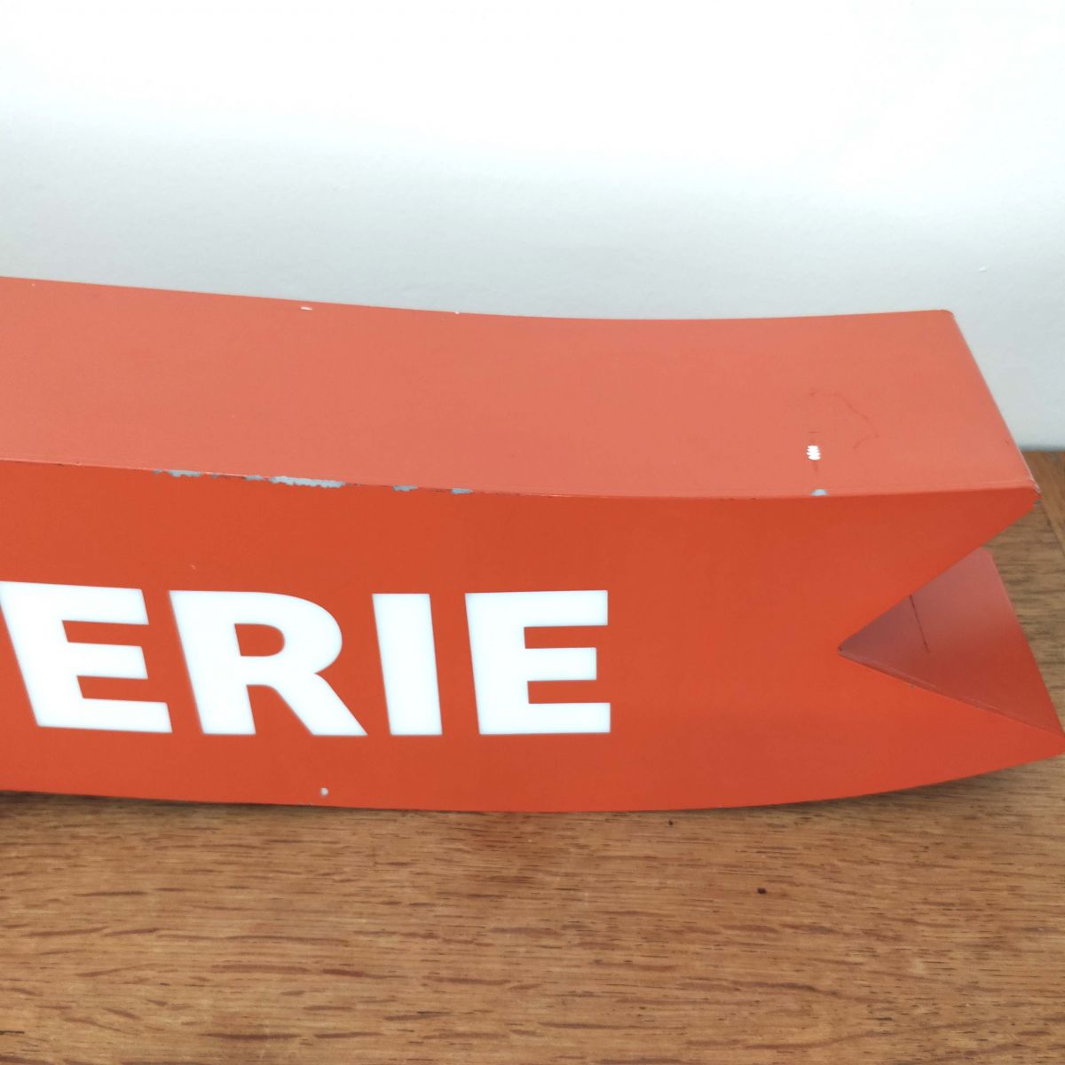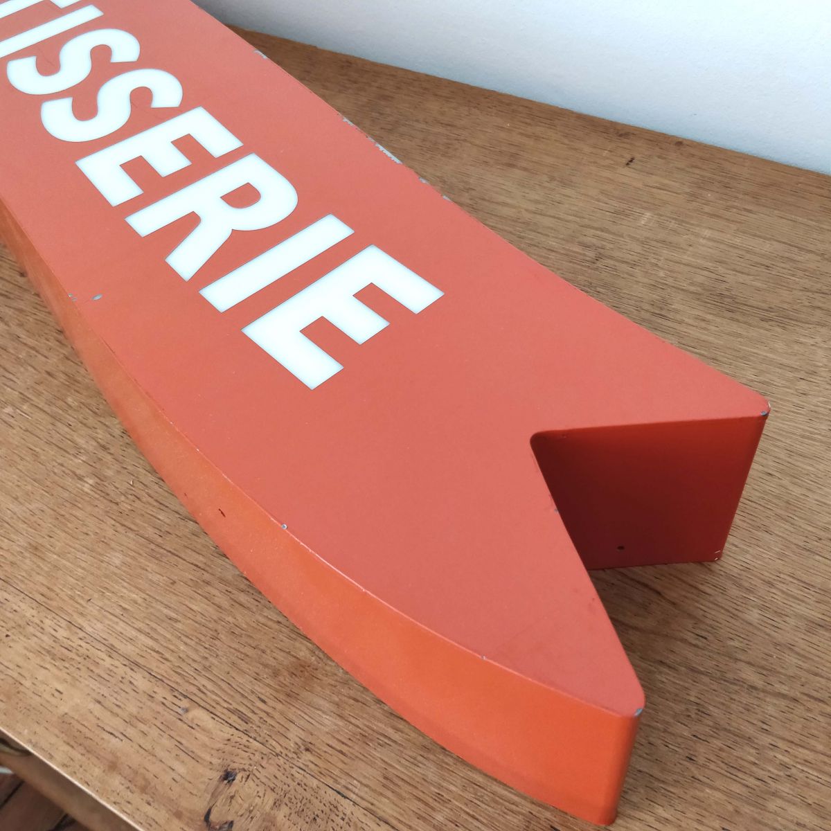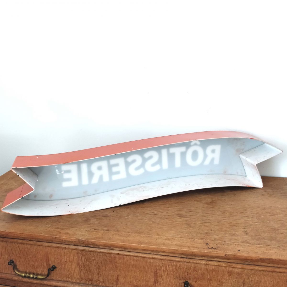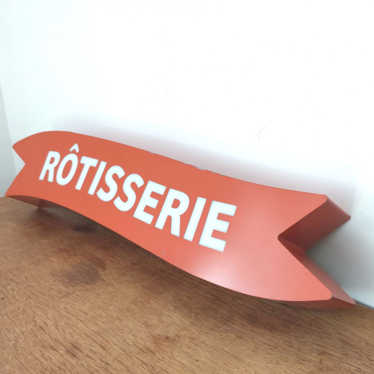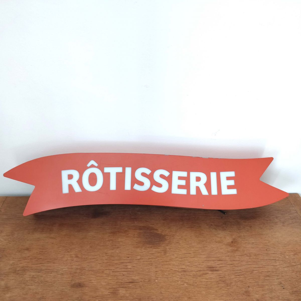 Enseigne atypique de rôtisserie en plexiglass avec lettrage translucide, bel état à noter des petits manques de peinture et petits trous sur dessus et dessous.