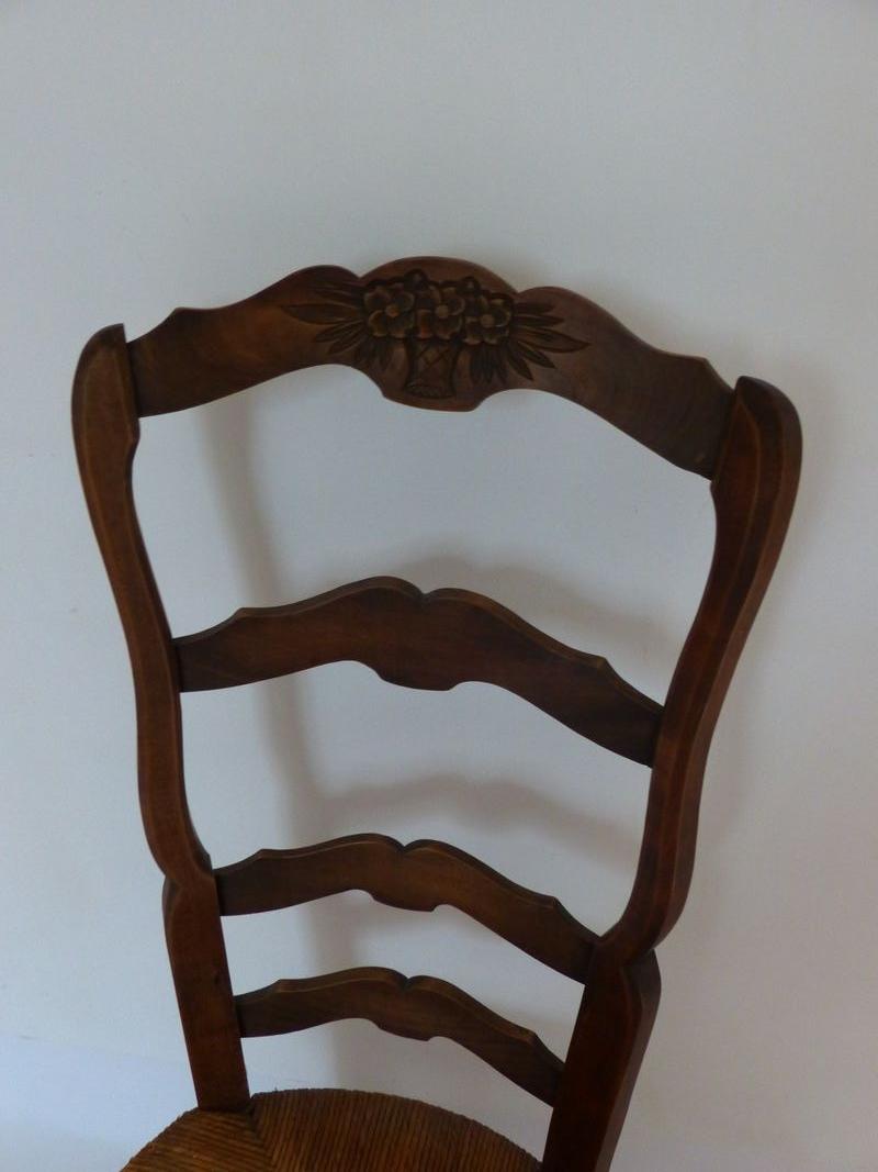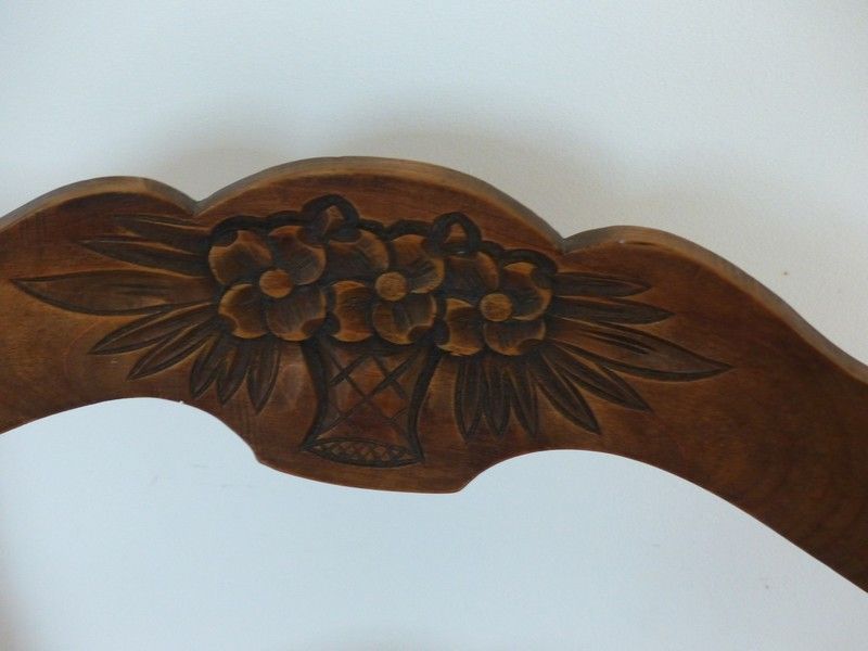 Chaise basse paillée de nourrice au dossier sculpté d'un panier de fleurs. En très bon état, confortable, assise un peu usée par le temps. Dimension : hauteur de l'assise = 36 cm, hauteur du dossier = 98 cm, largeur = 42 cm, profondeur = 39 cm